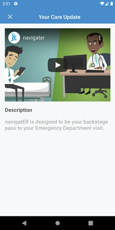navigatER™ is designed to improve the patient experience by removing barriers to communication and allowing patients to anticipate and understand their own clinical course. With navigatER™ patients become “part of the team” rather than a passive bystander waiting for information about their care and medical issues. navigatER™ provides patients with a “backstage pass” to their emergency health care visit.
