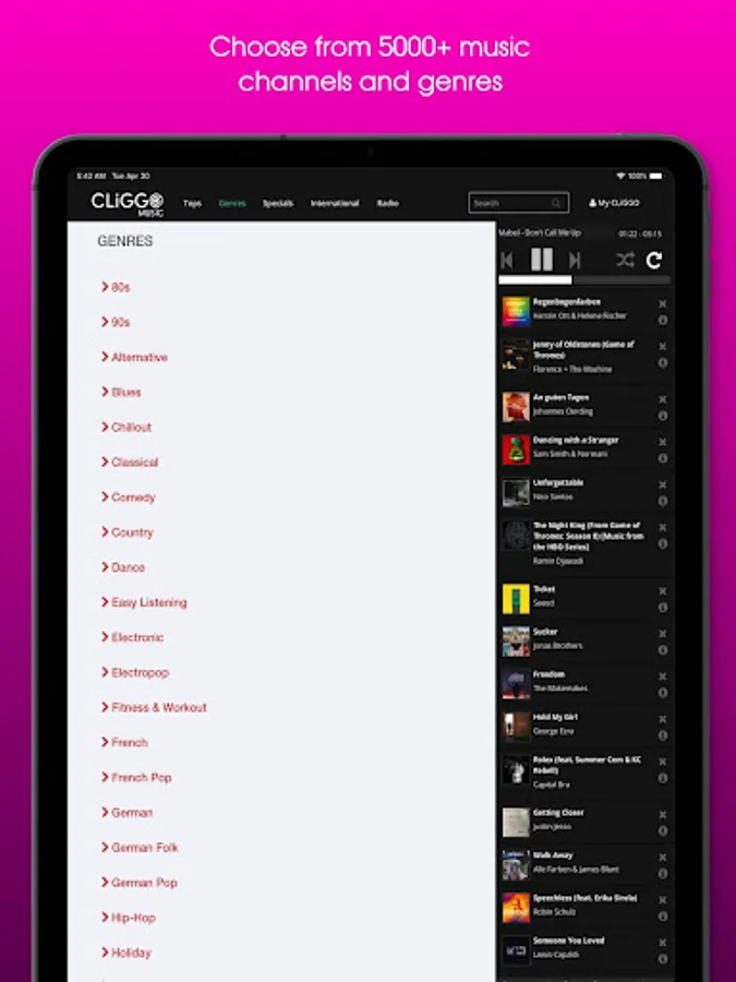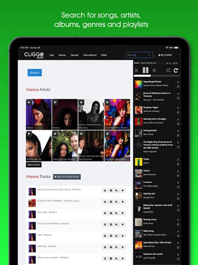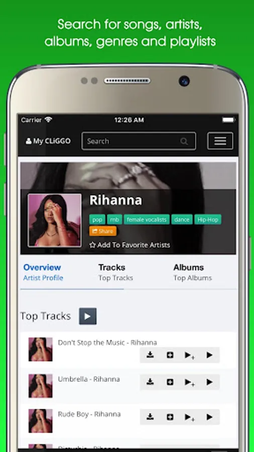 CLiGGO MUSIC, the free music app to listen for free on mobile devices, comes with a clean and neat design and the interface is so user-friendly that you will get the whole idea after playing your first favorite song. You just need to browse through available artists or music genres and stream your favorite music easily with highest possible quality.