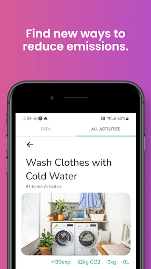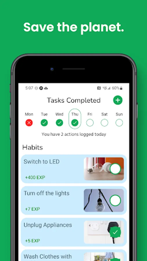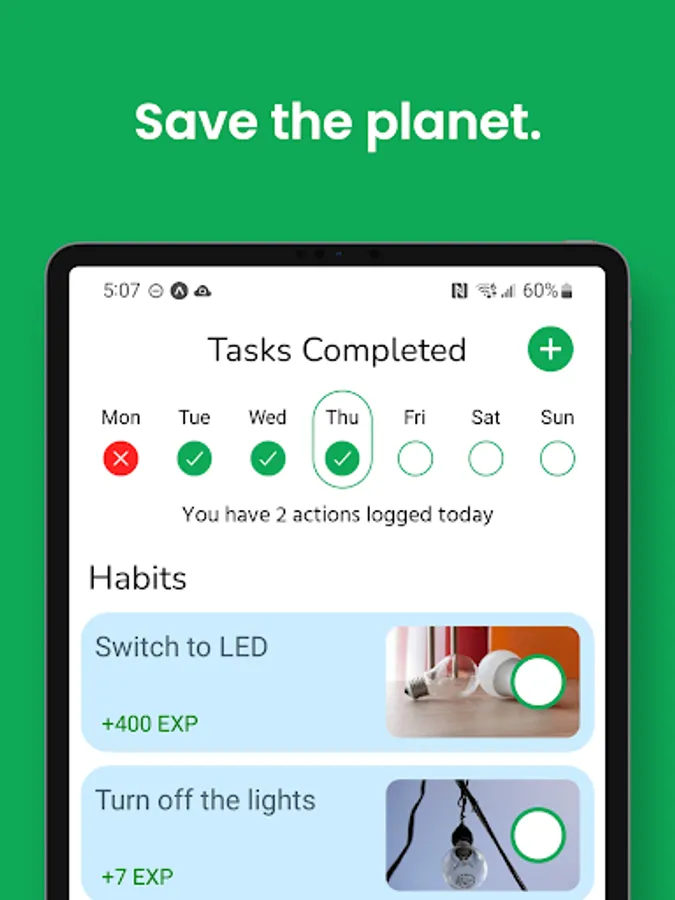 - Complete tasks to reduce emissions! All stats are stored and easily viewed!