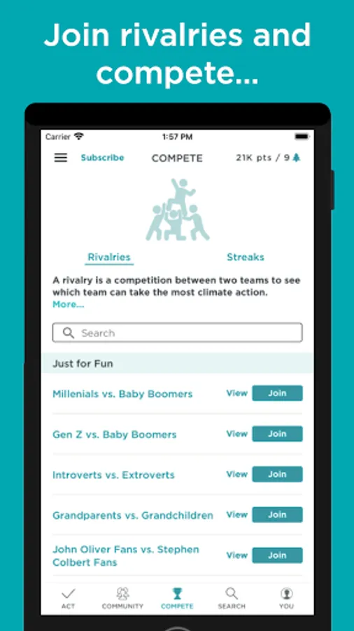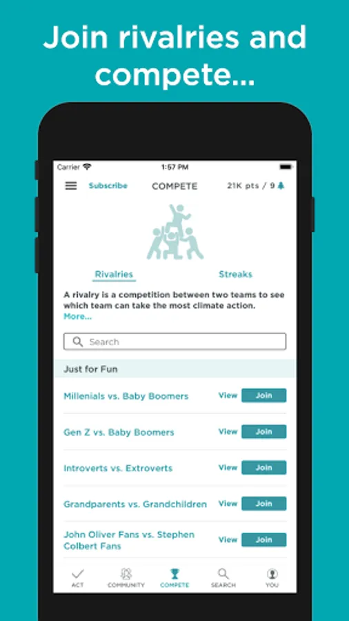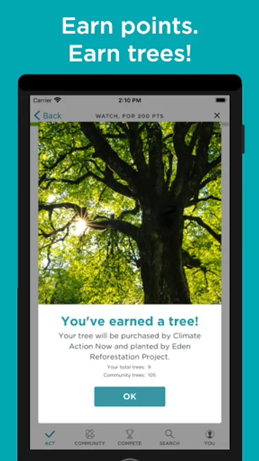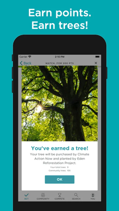 REWARDING. Every action you take earns points, and when you’ve earned enough points, we’ll plant a real tree on your behalf. Every action you take sets an example for others to follow. Join a team and every action you take contributes to the team’s total and helps it win rivalries with other teams. Through all these things, you earn the most important reward of all: knowing that you’re doing your part to save our planet.