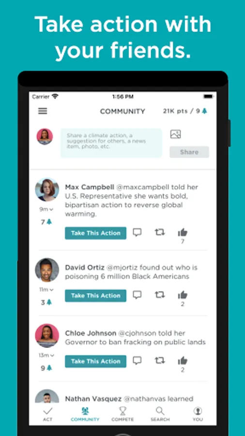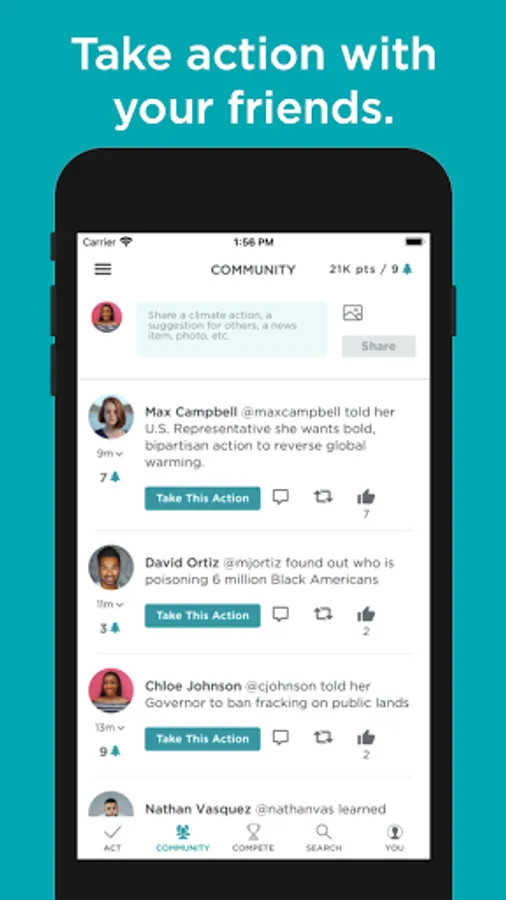 Did you know that many leading climate activists say the most important thing you can do about climate change is to talk about it? Every action you take with Climate Action Now is automatically posted to our Community Feed where people who follow you can see it, take that action also, comment on it, like it, and share it with others.