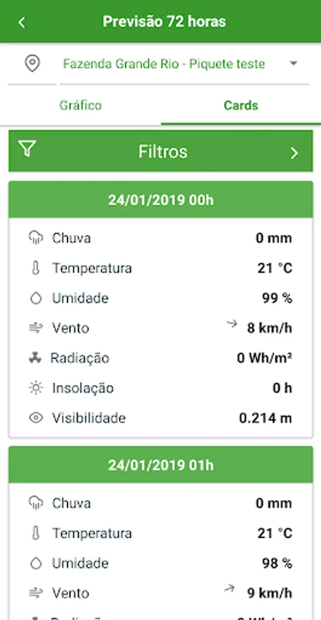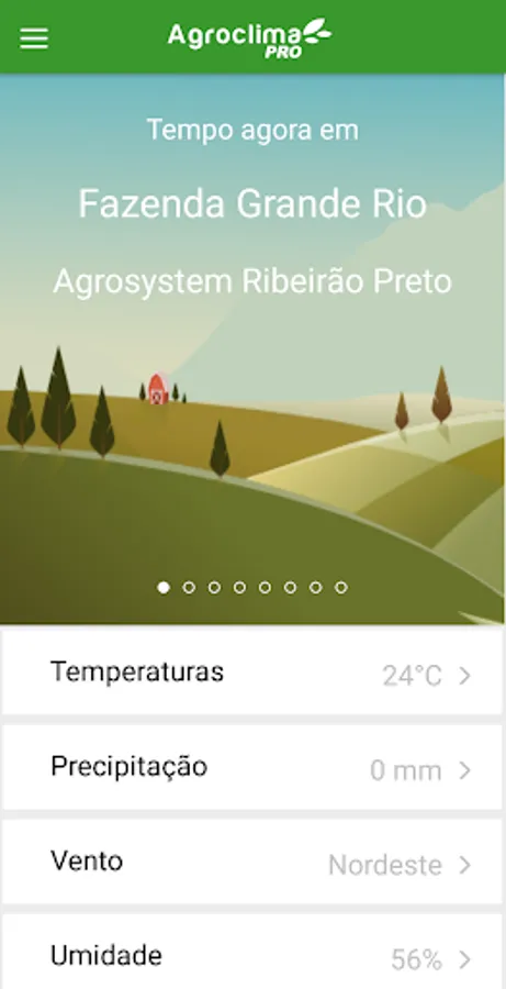 When you log in to the application, already in the main screen, the data of your stations will be ready to be viewed quickly. Navigate through the stations through the main screen slider. If you do not have a weather station, you can view the weather station data that is closest to your farm.