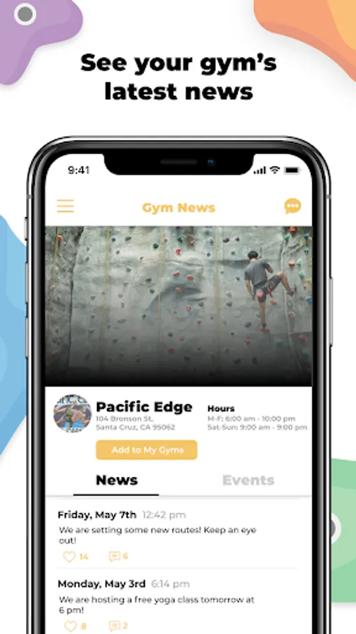 See all of your gym's news, classes, and events, on ClimbTime! It's the easiest way to stay updated on a new problem set, sign up for a belay class, and RSVP for a climbing movie night!