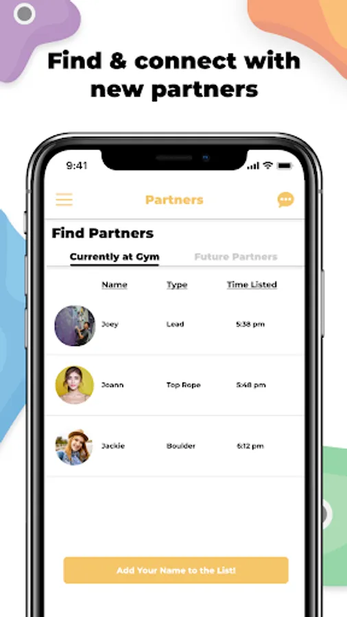 Stop using the bulletin board at your gym and see ClimbTime's live list of users at the gym!!! View partner listings and message them to start climbing together! Looking for more consistent partners for the future? Use our filters to find your perfect climbing partner!