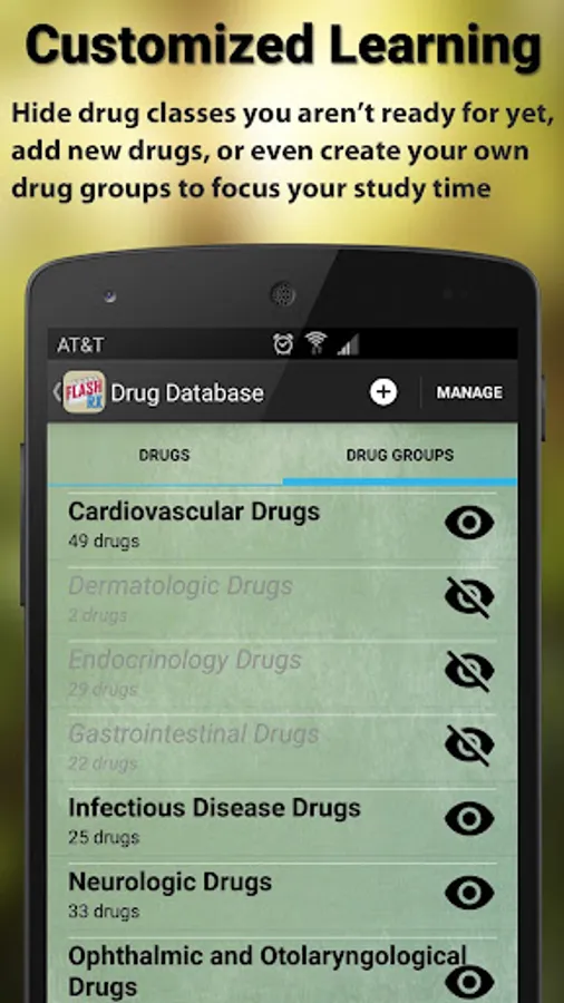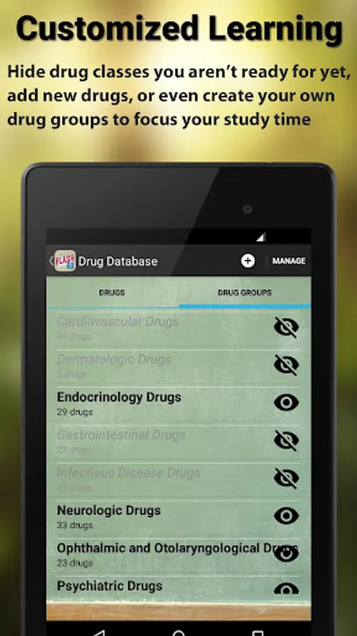 • "Group" drugs into therapeutic classes or your own custom drug lists. These groups can be hidden or shown to focus your studying