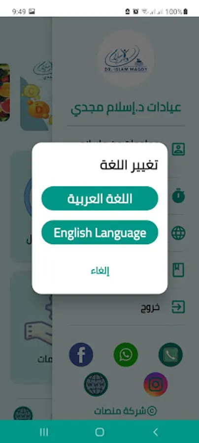 The application is available in Arabic and English.