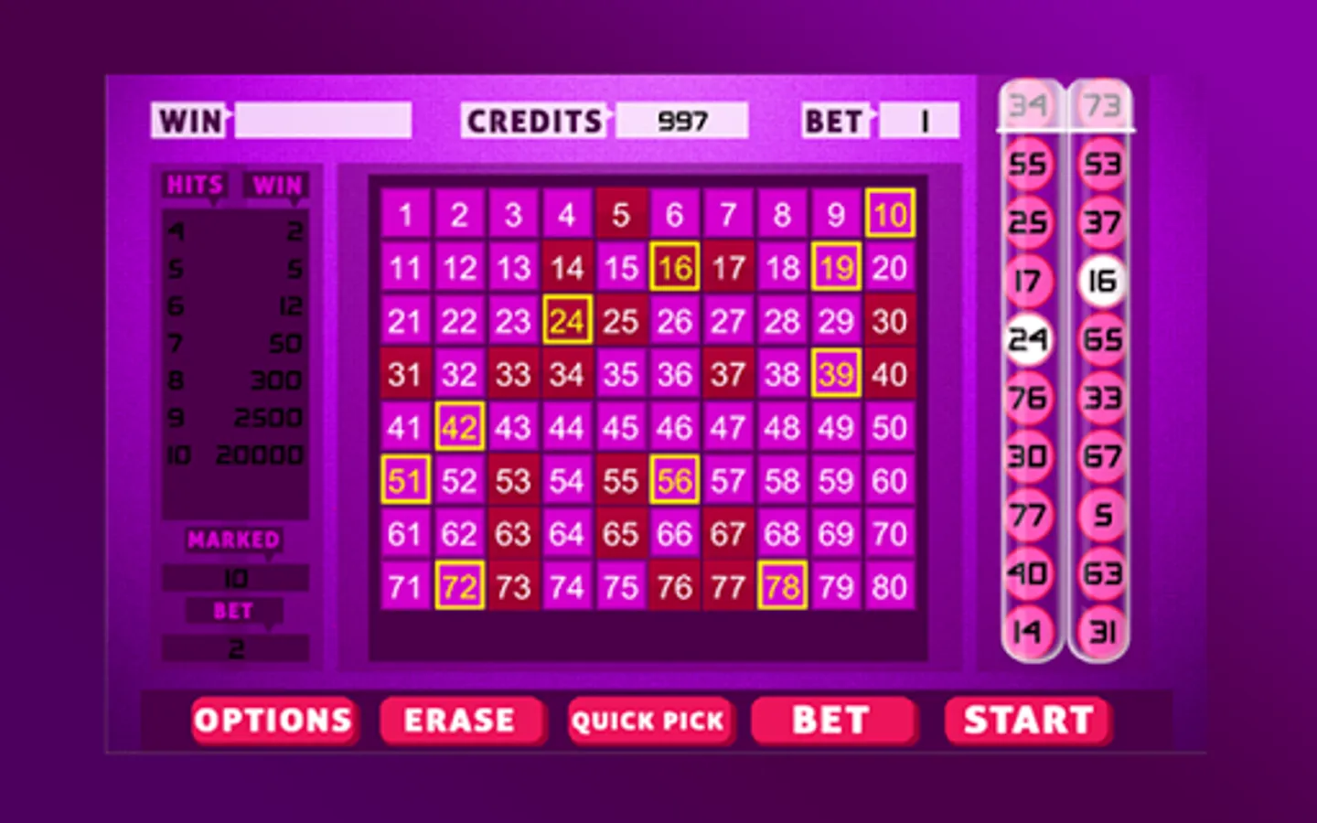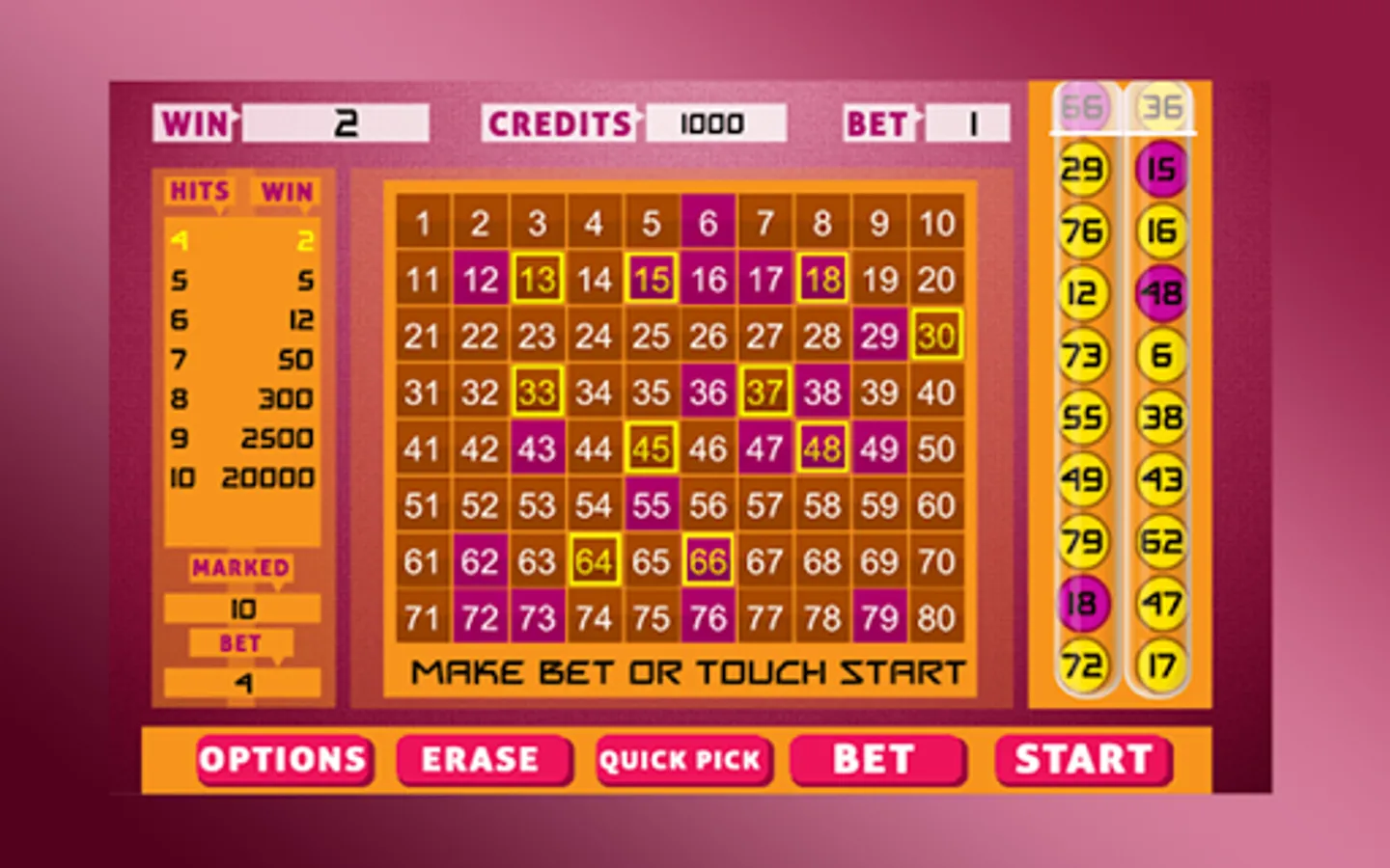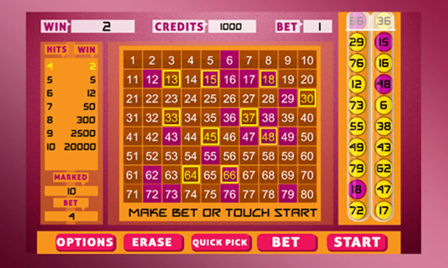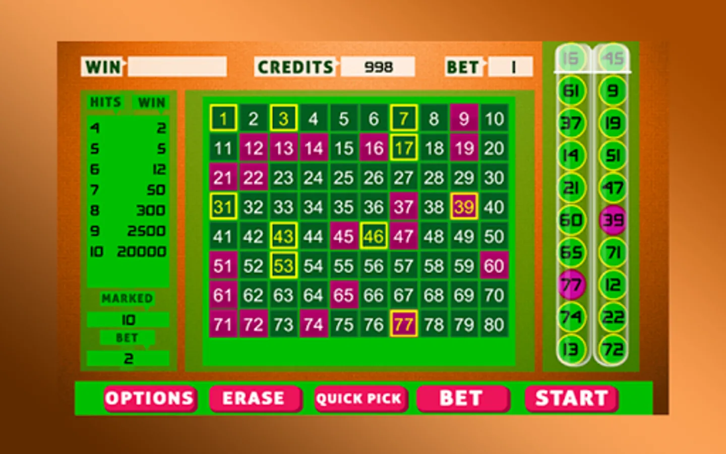 Keno is a lottery gambling game. Predict which numbers will be drawn by marking from 1 to 15 of the numbered blocks ("Spots") on the board. To mark a block simply hover over the block and tap it. The block will change colour to indicate it has been marked. To remove a mark, just tap on the block and it will change back to the original colour.