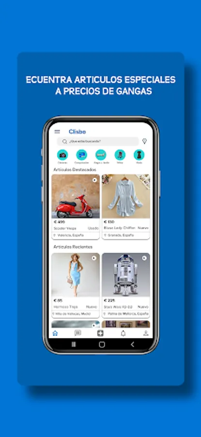 Clisbo Spain is the classified video Web/Application where you can buy, sell or give away all kinds of items, from household appliances, computers or mobile phones to used cars, motorbikes and bikes, as well as second-hand sporting goods and things for babies or furniture for the home, apartments and houses. You can also find clothes, dresses, shoes, jewelry and fashion accessories or accessories that other users sell near you at a very good price.