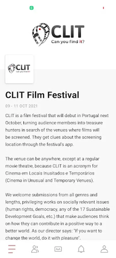 CLIT is a film festival that will debut in Portugal, turning audience members into treasure hunters in search of the venues where films will be screened. They get clues about the screening location through the festival's app.