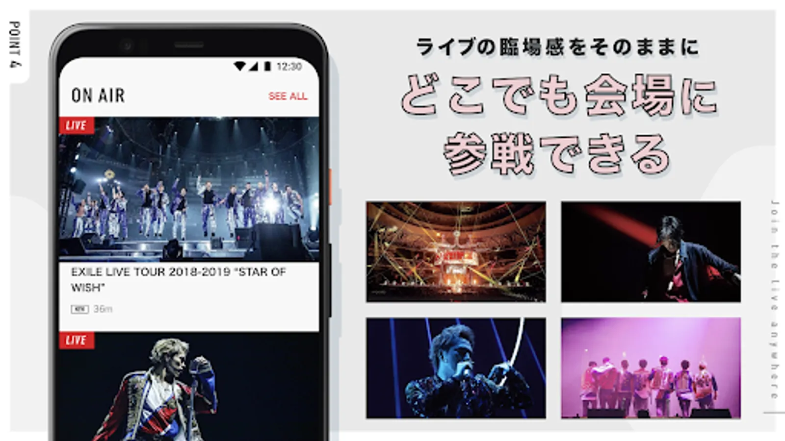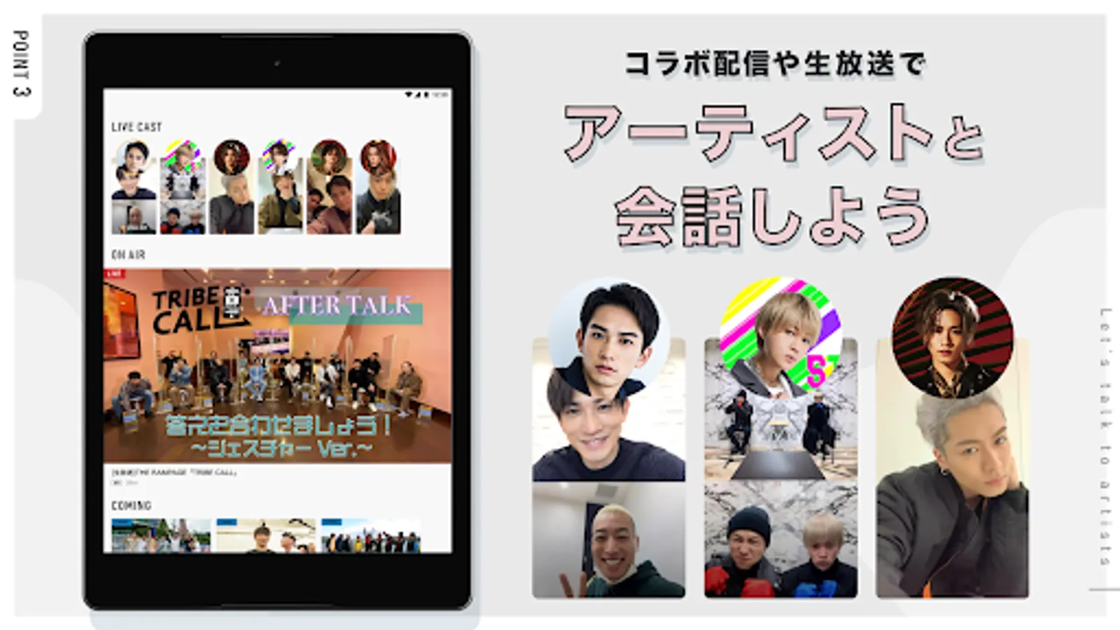 Convenient live streaming enables artists to do live broadcasts anywhere with ease. As a two-way communication tool connecting artists with users, users can post comments with the chat feature in real time while watching live streamed video of group members backstage or in the dressing room at live performances, or of solo broadcasts from home.