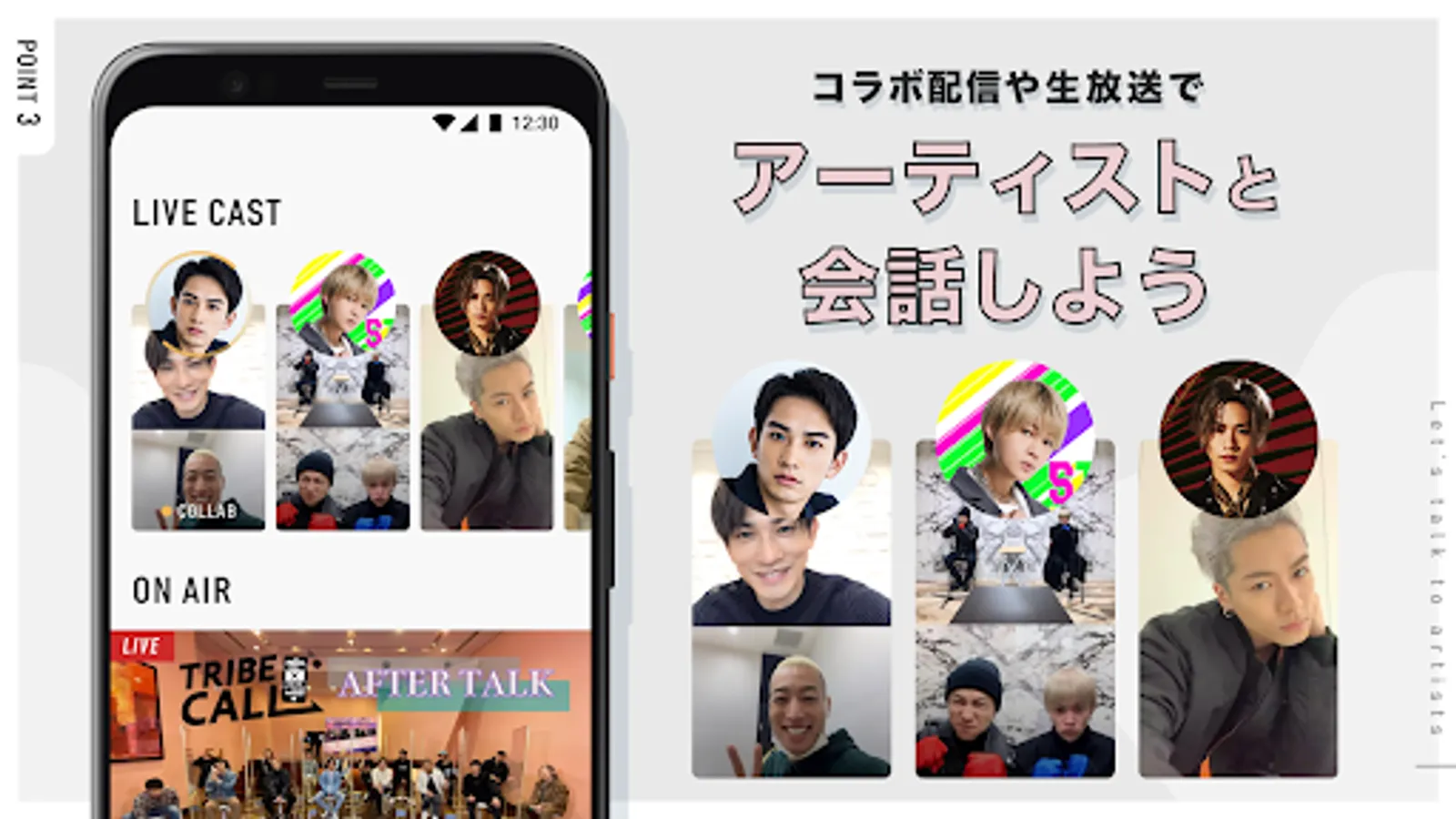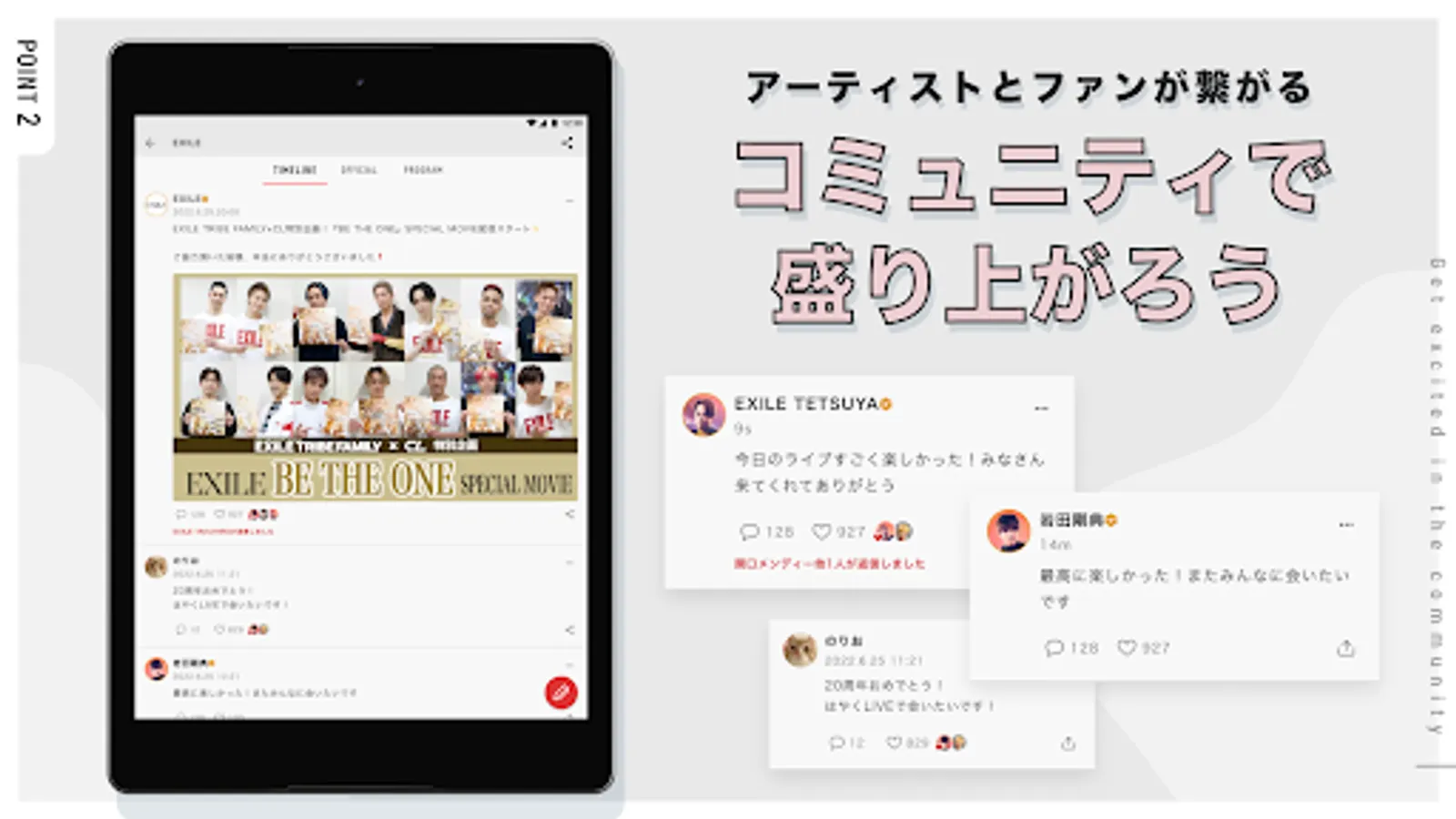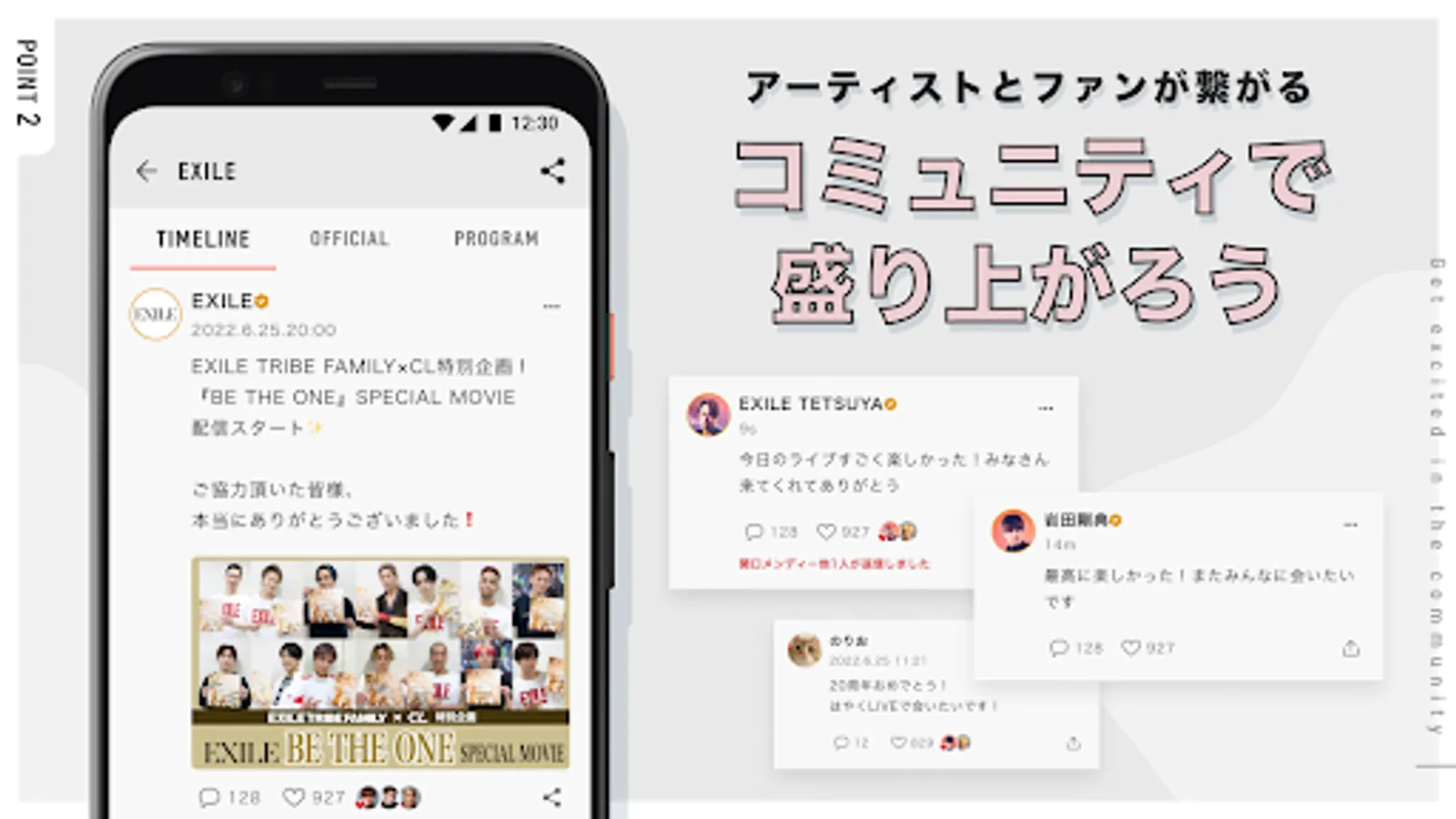In the community for each artist group, users can communicate with the member artists and other users, sharing the excitement of the best moments together any time!
