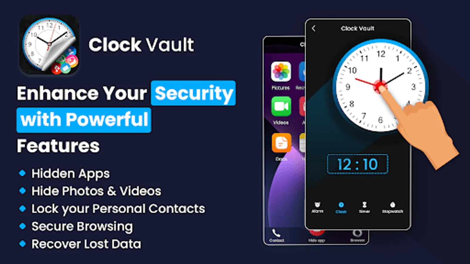 Your search ends here. Clock Vault App hider can help you to hide any of your apps, and keep your privacy safe by hide apps & Hide Photos Videos in the clock Vault App hider 2023. You can open hidden apps in the clock Vault or the interface of your phone. Clock Vault provides a hidden App & Gallery Vault formula function, you can put your pictures into the gallery vault, and others can not see these hide photos & hide videos and Personal Files.