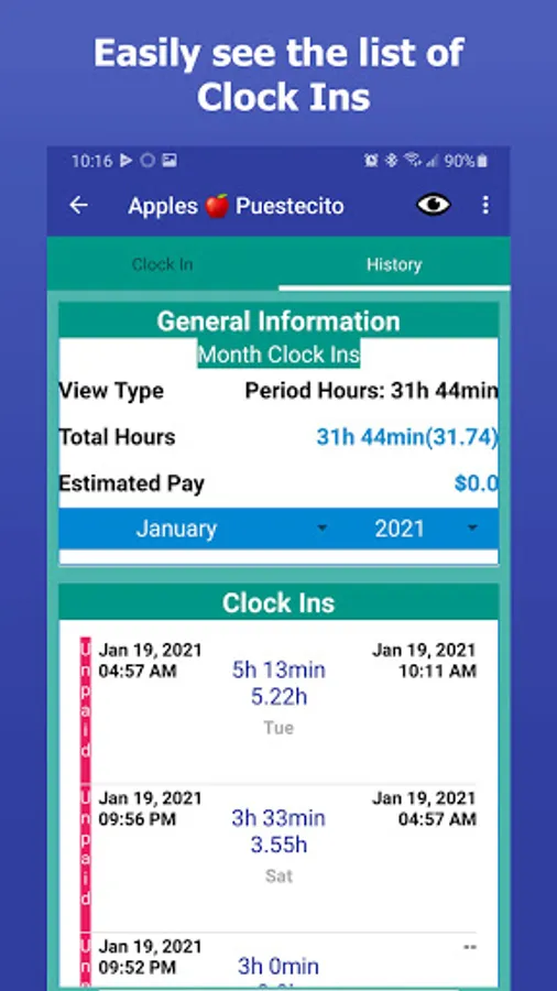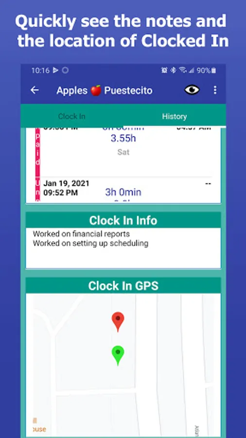 • GPS Clock In Feature - document your location when you clock in/out. You can enable/disable this feature at any time.