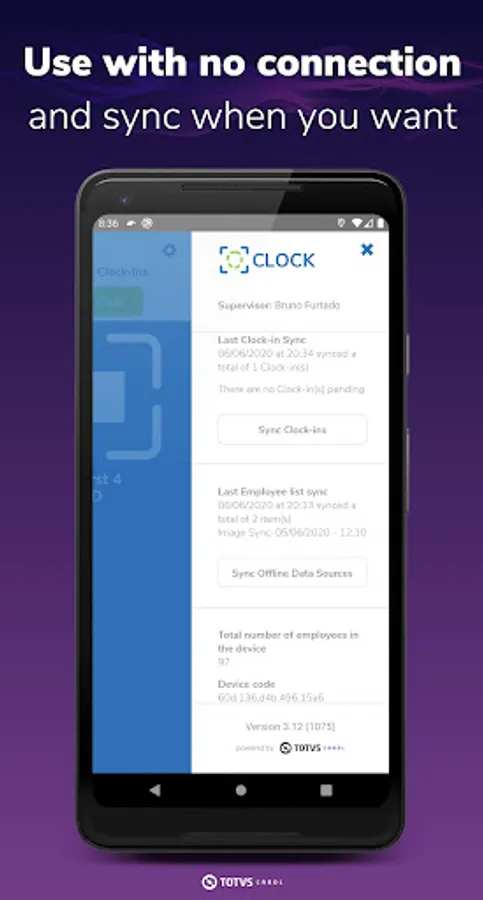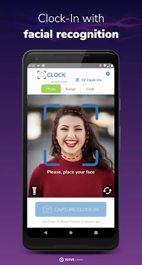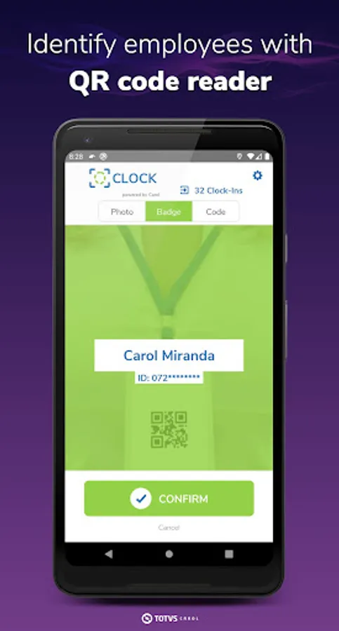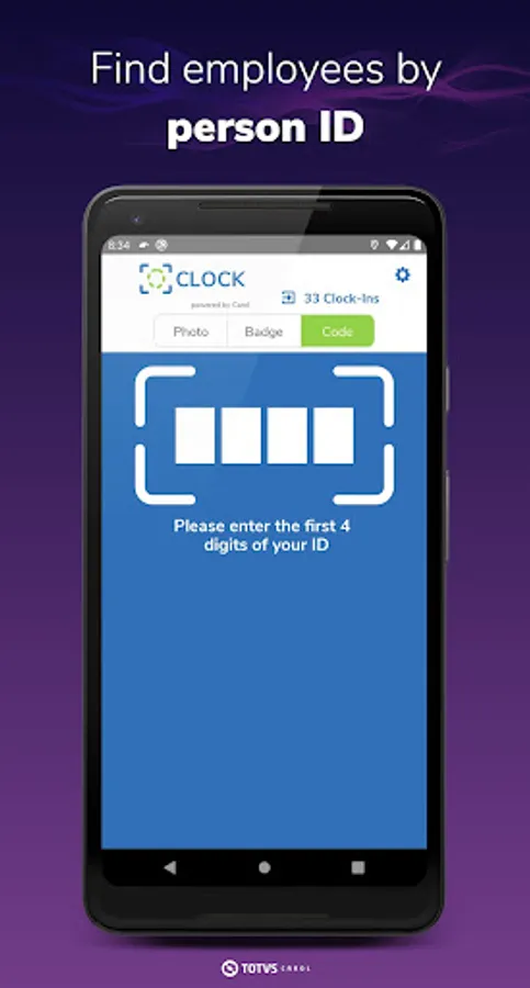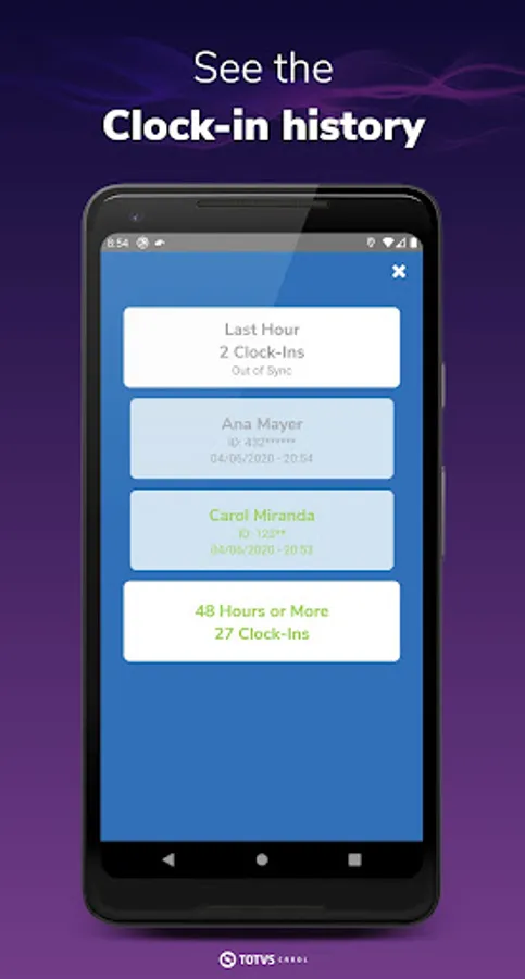 Attention: To use the app you must have an account on Carol platform, a Data Management solution powered by TOTVS. Contact carol.clockin@totvs.com.br for more information.