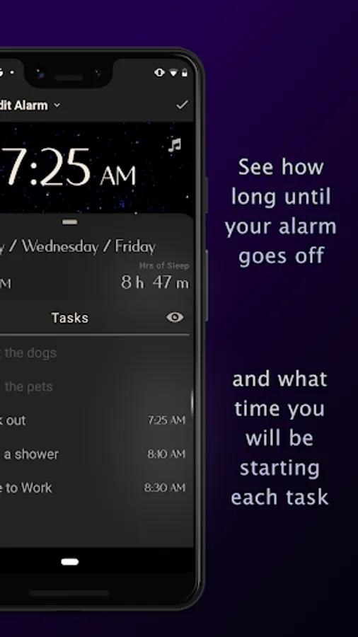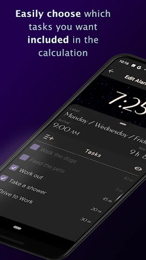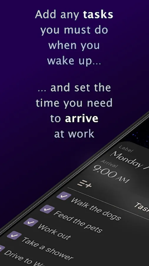 Simply choose an arrival time, add some tasks along with their durations, and watch your alarm time automatically update to reflect the additional time required in the morning. Tasks can easily be modified with different durations (eg. if you only plan on doing a short workout, instead of a full one tomorrow), and can easily be reordered to reflect the real-life sequence you will be performing them. Moreover, tasks can be enabled/disabled with a single tap to include/exclude them from the alarm calculation (eg. you’re going to completely skip the work out tomorrow).