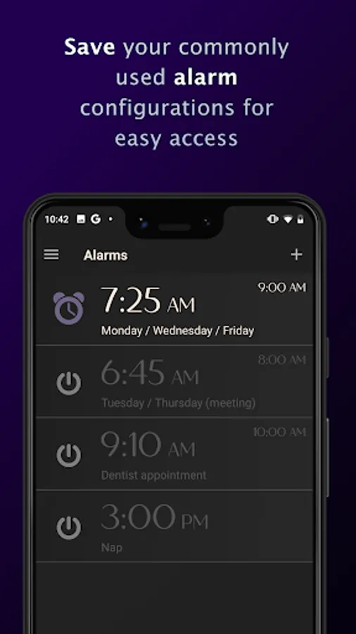 To further simplify this pre-bedtime chore, you can save your frequently-used alarm configurations, and enabled/disable them without having to even worry about setting an arrival time or task list. For example, maybe you have have an early class on Monday/Wednesday/Friday, but the other days have later starts - you can dedicate a saved alarm configuration for this type of day.