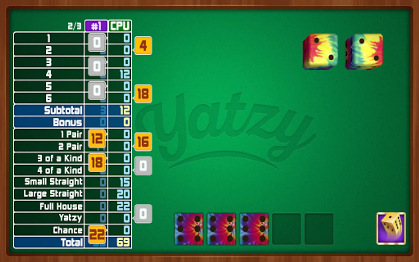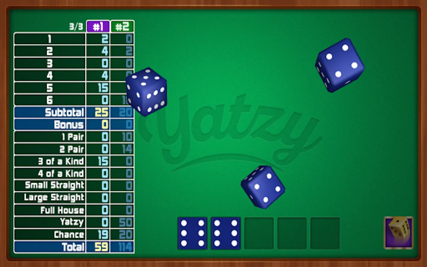Yatzy is a dice game. Part luck, part strategy, and ALL FUN! Play solitaire-style, against the computer, or "pass and play" against another player on the same device.