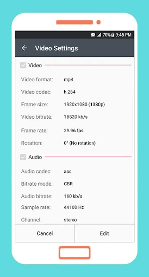 - You can choose output video settings like file format, codec, bit rate, frame rate, rotation and video dimension.