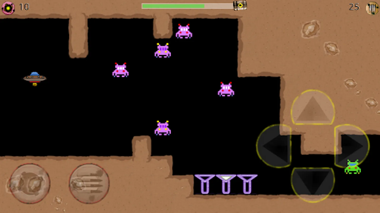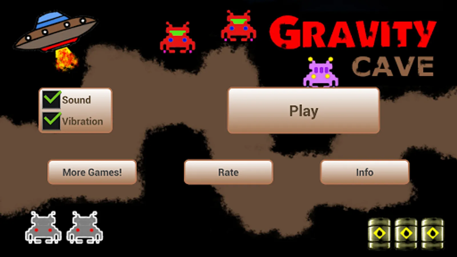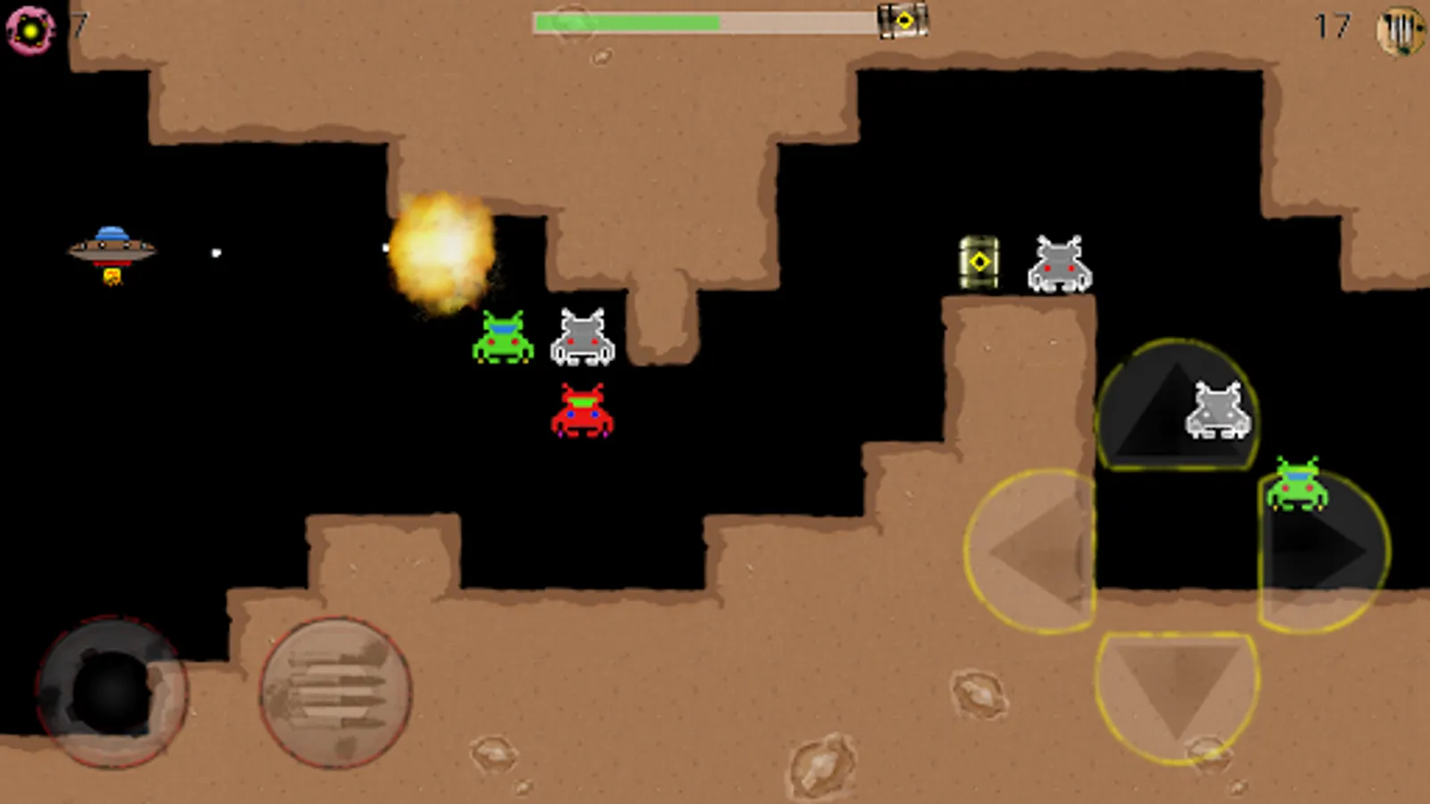 Gravity Cave is a modern game in retro style, space shooter that involves aliens and spaceships. You are in a hostile environment populated by strange monsters that tend to throw against your ship to destroy it. The aliens have found their habitat in a quarry. Your goal is to cross the quarry and reach safely to the end point highlighted by a green arrow. Along the way you will face a variety of obstacles to overcome: aliens of various types, barriers lightning, cannons, fire, gravity inverters and much more. To survive in this environment, you need to shoot the aliens and to do that you have at your disposal bullets and bombs. Many aliens affected will become valuable resources to continue the game: fuel, bullets, bombs or shields. Find out everything you find along the way and keeping balance in your space ship quickly reach the exit.