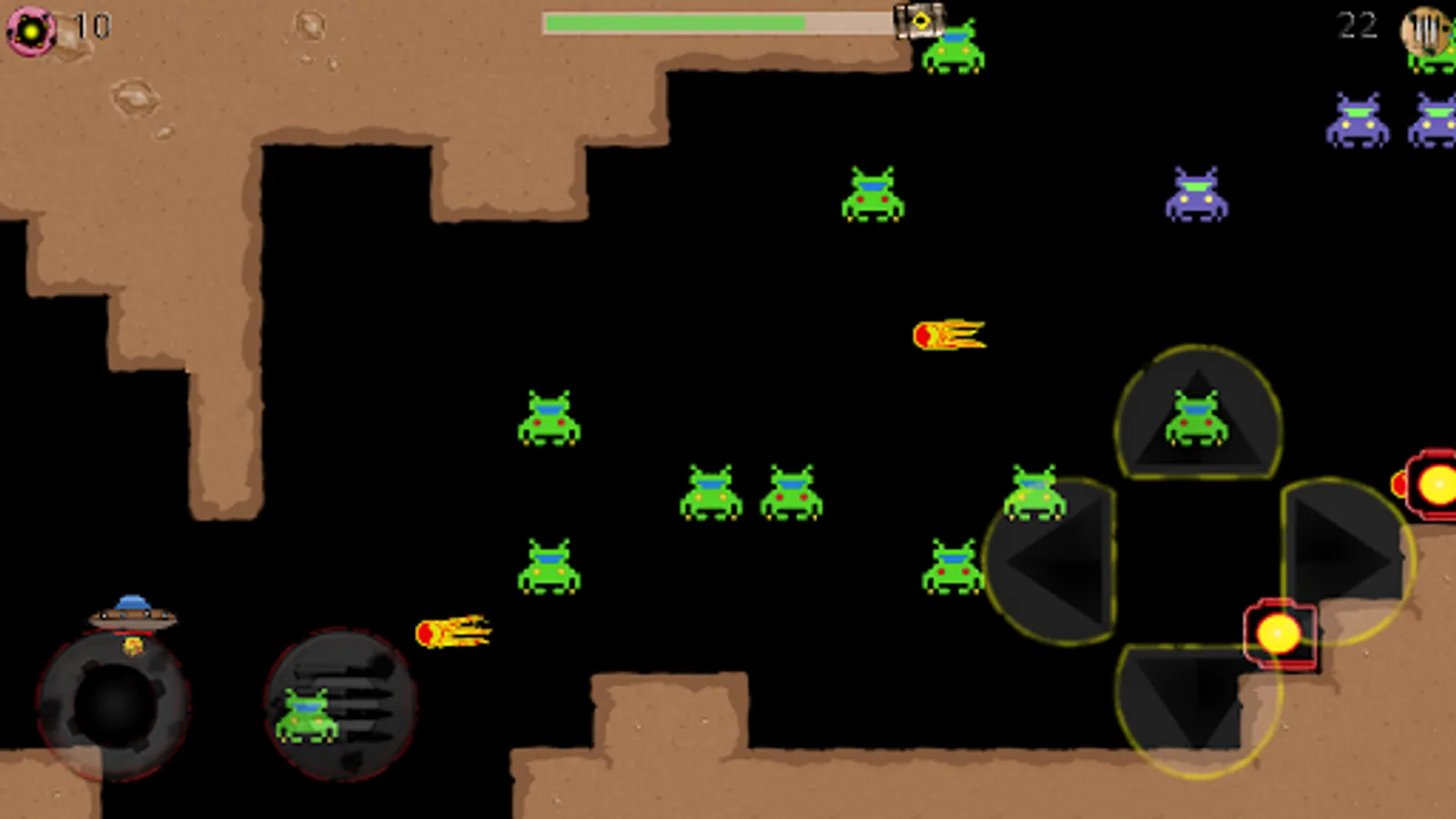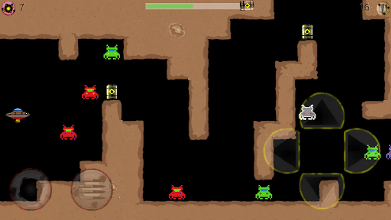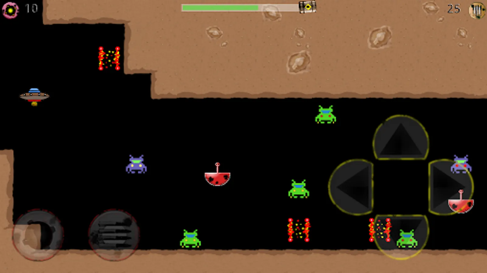 Gravity Cave is a modern game in retro style, space shooter that involves aliens and spaceships. You are in a hostile environment populated by strange monsters that tend to throw against your ship to destroy it. The aliens have found their habitat in a quarry. Your goal is to cross the quarry and reach safely to the end point highlighted by a green arrow. Along the way you will face a variety of obstacles to overcome: aliens of various types, barriers lightning, cannons, fire, gravity inverters and much more. To survive in this environment, you need to shoot the aliens and to do that you have at your disposal bullets and bombs. Many aliens affected will become valuable resources to continue the game: fuel, bullets, bombs or shields. Find out everything you find along the way and keeping balance in your space ship quickly reach the exit.