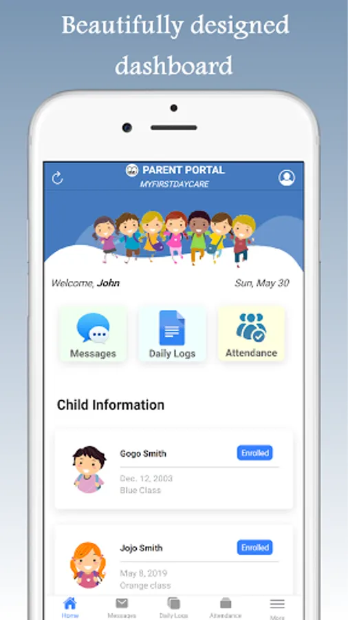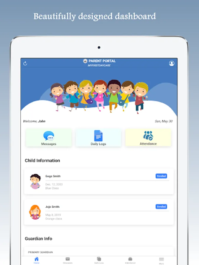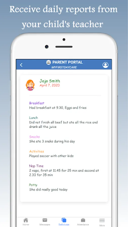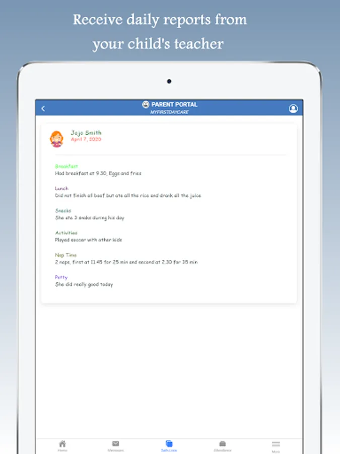 Connect with your child's daycare provider and/or teacher. Send and receive messages about your child's activities, find out when they had their nap, what they ate for lunch, and see pictures or videos of your child's fun activities throughout the day. Get important notifications about your child's progress and needs. It's like being next to your child while he/she is at the daycare center!