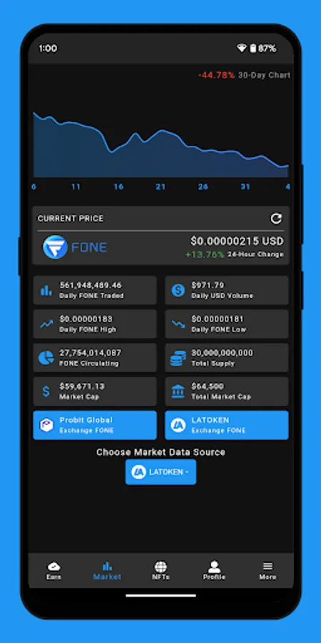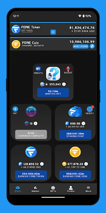 The application requires internet access to sign in and connect with the Fone server. Press "Start Earning" to connect. The server handles everything in the cloud. Therefore, once earning is established, the app does not require the device to keep it open or in the background to earn FONE. To avoid interruption, a notification is sent when the earning process ends to extend Earnings for the next seven days. At any time, open the Fone Network app to check the average earning statistics, track the earning progress, or see the FONE market statistics. Stake your FONE and get up to a 1% monthly return!