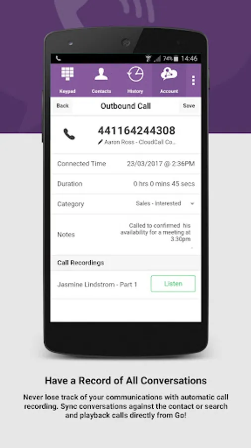 With CloudCall Go! all calls are recorded and you can make additional notes that will be attached to the contact’s record within your CRM. This information is also added to your call history records and are accessible from Go!.