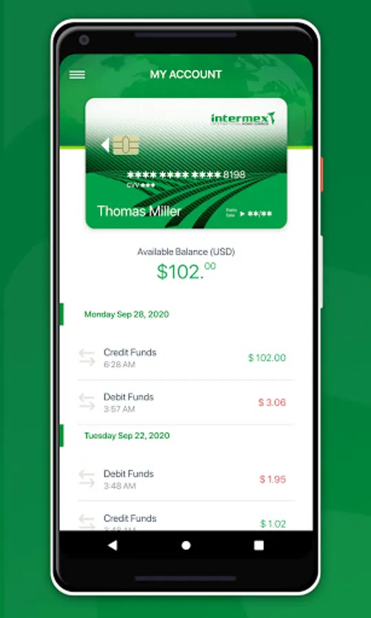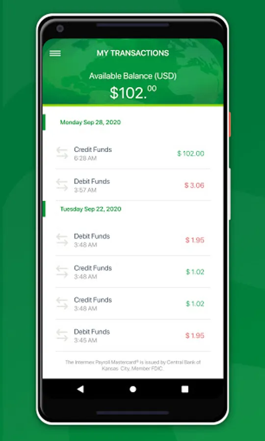 Intermex Mobile App for use with the Intermex Payroll Martercard®. Use the App to monitor all account activity, locate an ATM, transfer funds to other Intermex Cards, update information and freeze your account to prevent unauthorized use.
