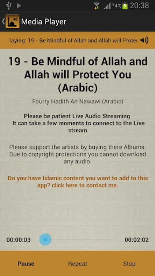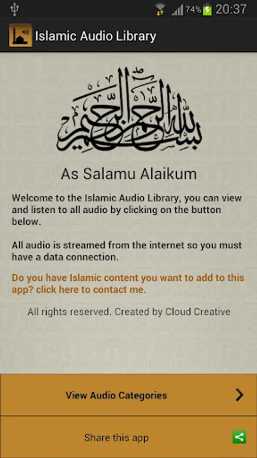Islamic Audio Library streams islamic content direct to your phone or tablet. All media is streamed live from the internet so you must have a data connection. NO ADVERTS