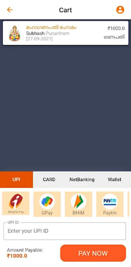 Devotees can book Pooja and make payment using Credit cards, Debit cards, Net Banking, UPI and also supports leading wallets.