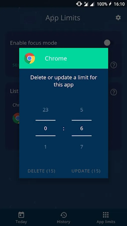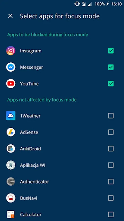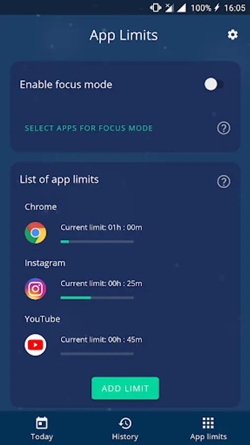 Besides standard app limits, there is a special Focus Mode. It allows you to block specific apps that you find the most distracting or you spend the most time within. You simply select those distracting apps, turn on the mode, and all of those apps won't be available for you unless you turn it off again.