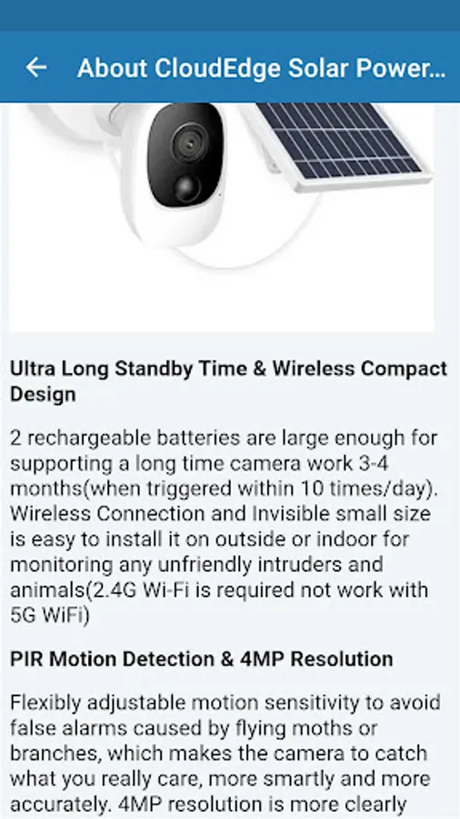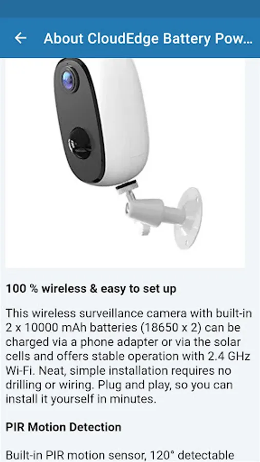 CloudEdge Battery Powered Camera comes with 2 rechargeable batteries. Motion detection is triggered 15 times per day, the camera can be used about 2-3 months. This app, in which the features CloudEdge Camera are explained, is a guide.