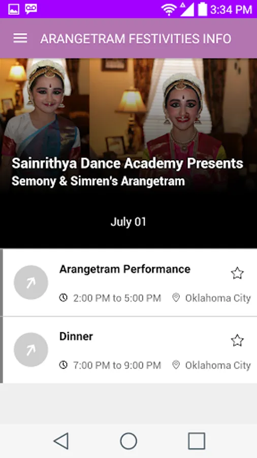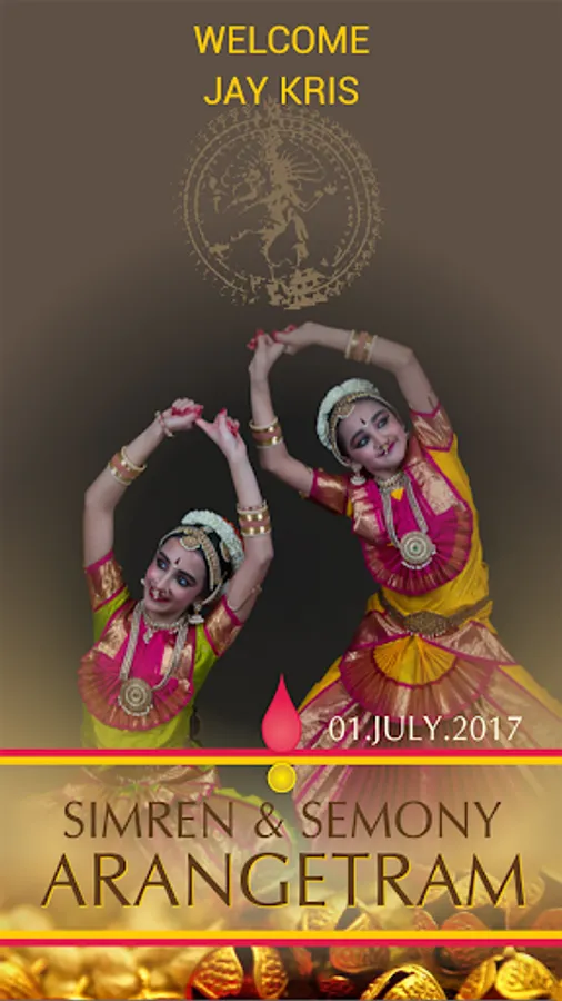 This App is an invitation for Simren and Semony’s Arangetram.This App will help our guests plan their trip and give them details about the Arangetram festivities. Once you login, you will be able to RSVP, plan your stay, learn about the dance performance, and Oklahoma City.
