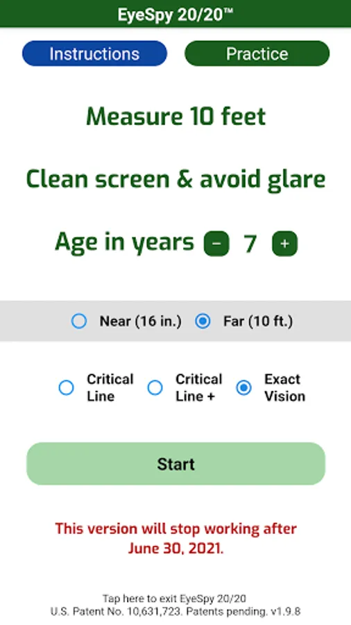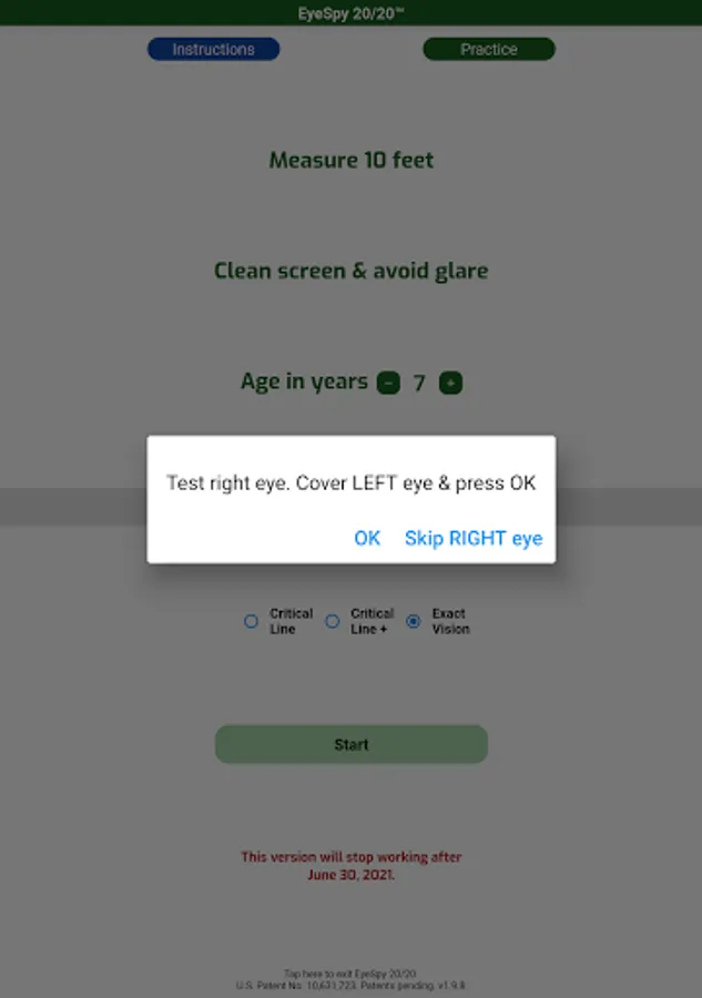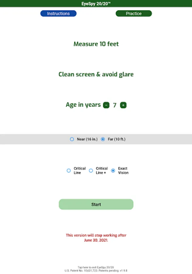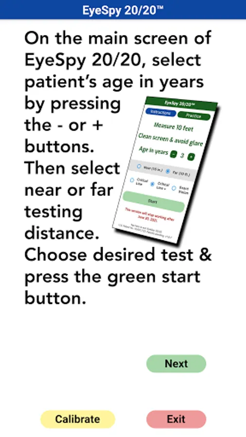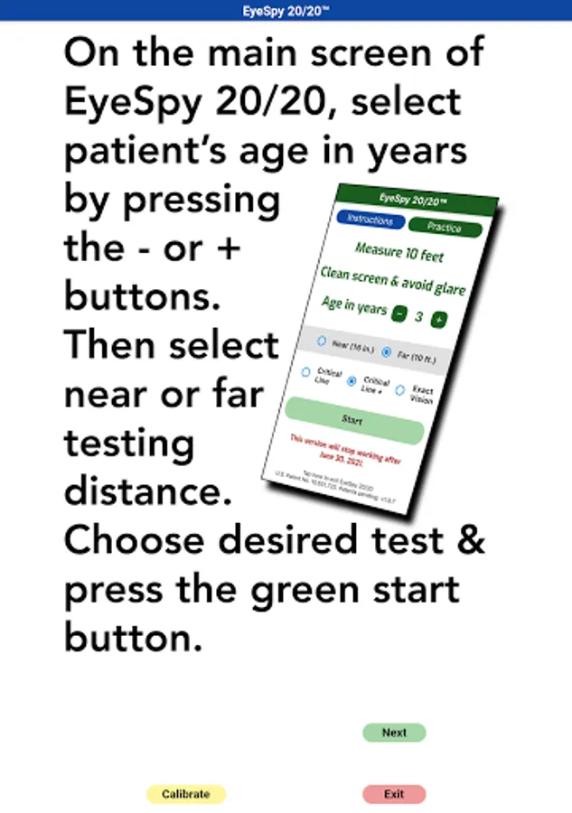 Using this application is very simple and extraordinarily fast. [1] Select the age range of the subject to be tested, [2] show the device screen to the subject and ask them to slowly "read" the 3 letters from the top - down. [3] once the subject has responded with ALL THREE RESPONSES, turn the device away from the subject and tap each letter once or twice to indicate correct or incorrect answers from the subject, [4] swipe the screen from left to right and [5] repeat the process. Follow the on-screen prompts regarding testing distance and which eye to cover at specific times.
