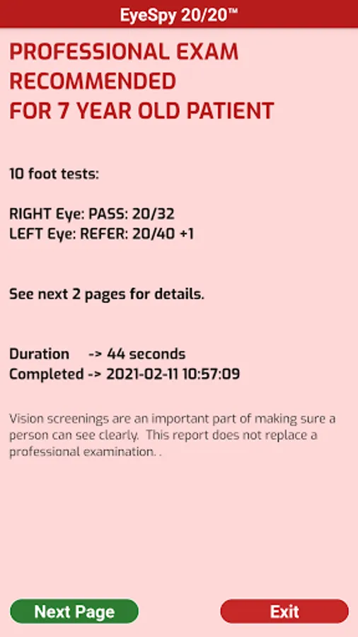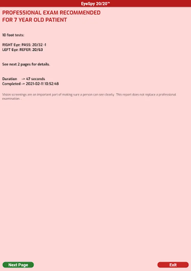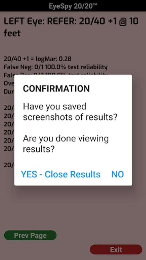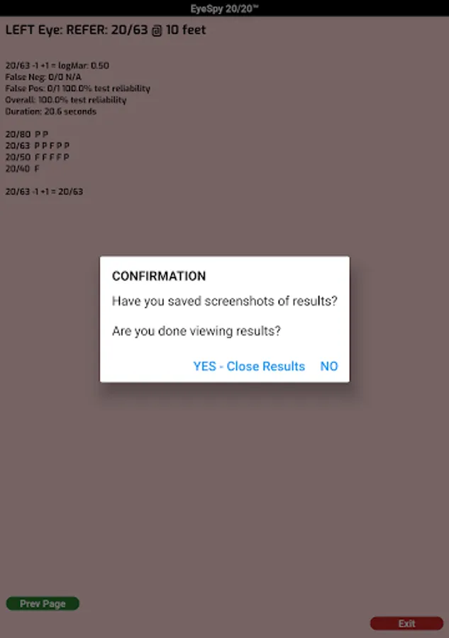 Upon completion of the test, the app reports visual acuity for each eye, at each test distance in both Snellen and precise logMar units. In addition, the system provides false positive, false negative and overall variance scores - unlike ANY other system available. Should the subject prove "unreliable", the system will report that the subject is unreliable and NOT provide a visual acuity assessment.