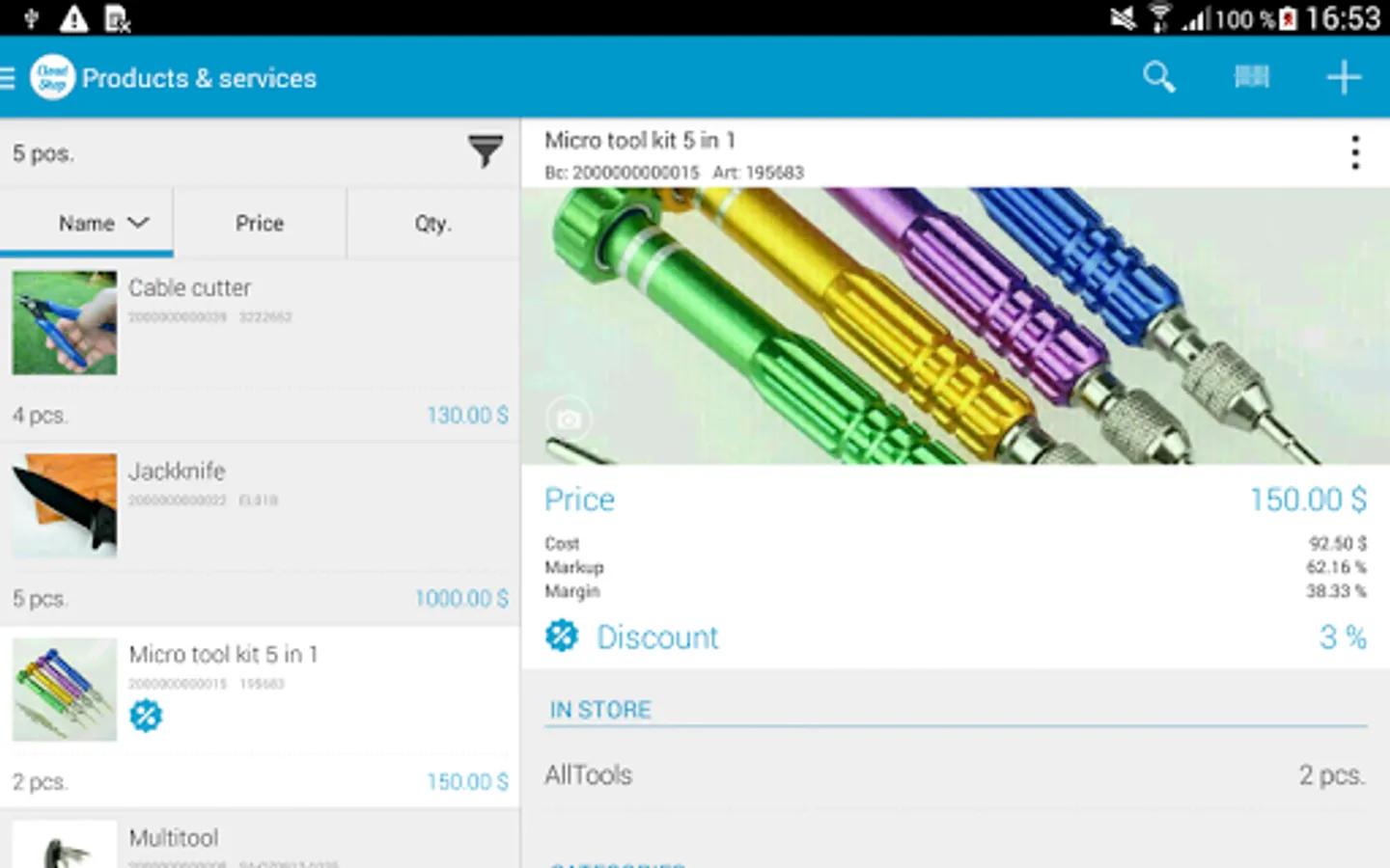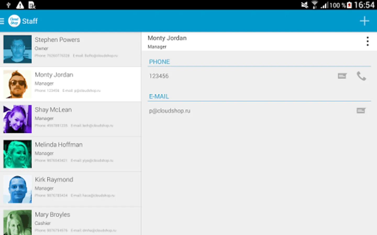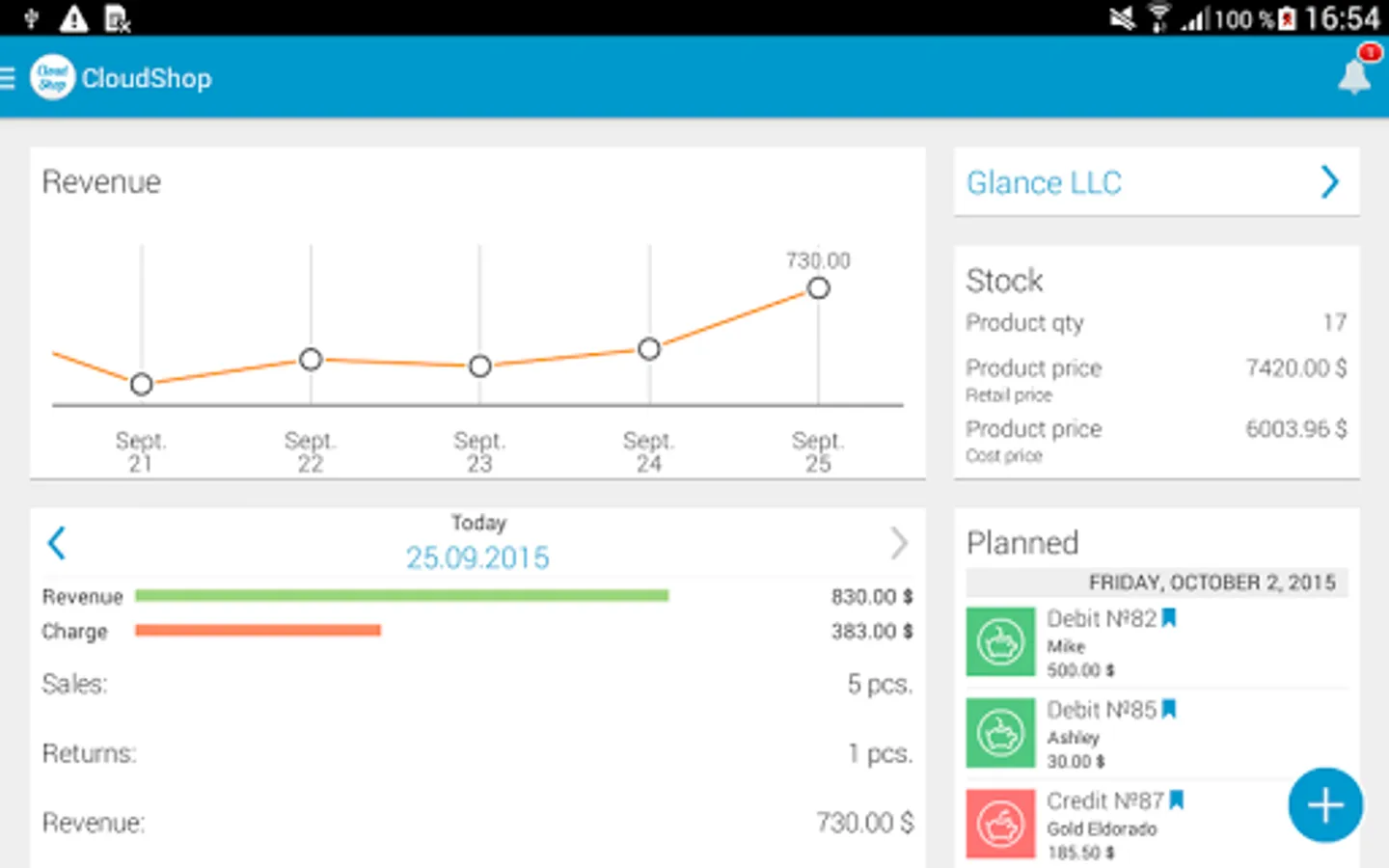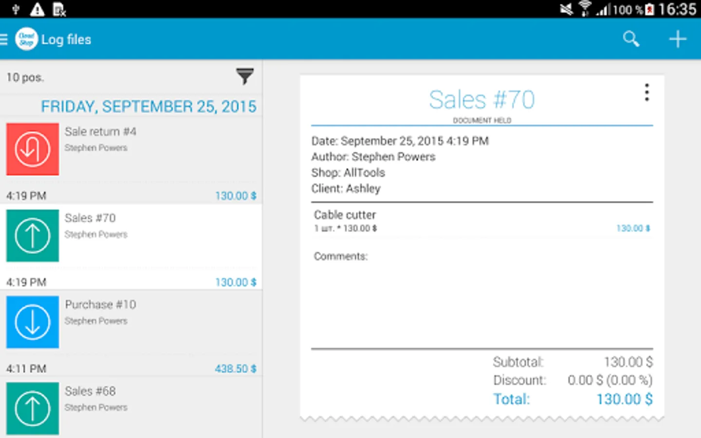 Manage your retail business with any number of store locations with global inventory control across all of them. List of shops, clients, employees and goods/services are always at hand on your mobile device.