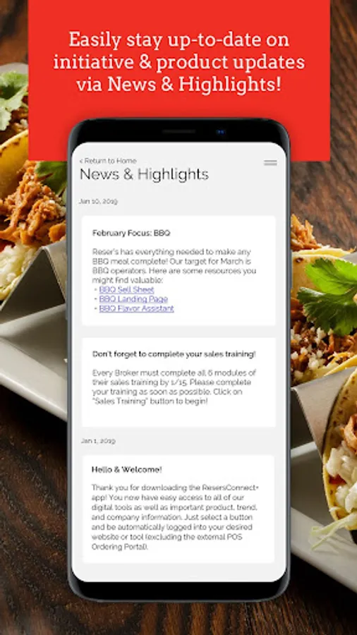 Stay connected with Reser's Foodservice on-the-go with convenient access to important product & initiative updates from the Reser's Marketing & Sales teams as well as one-click access to our Digital Product Guide, Sales Training, and more!