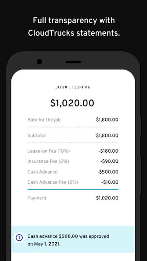 The CloudTrucks app helps truck drivers put more money in their hands, faster and with fewer headaches. Our app features include: