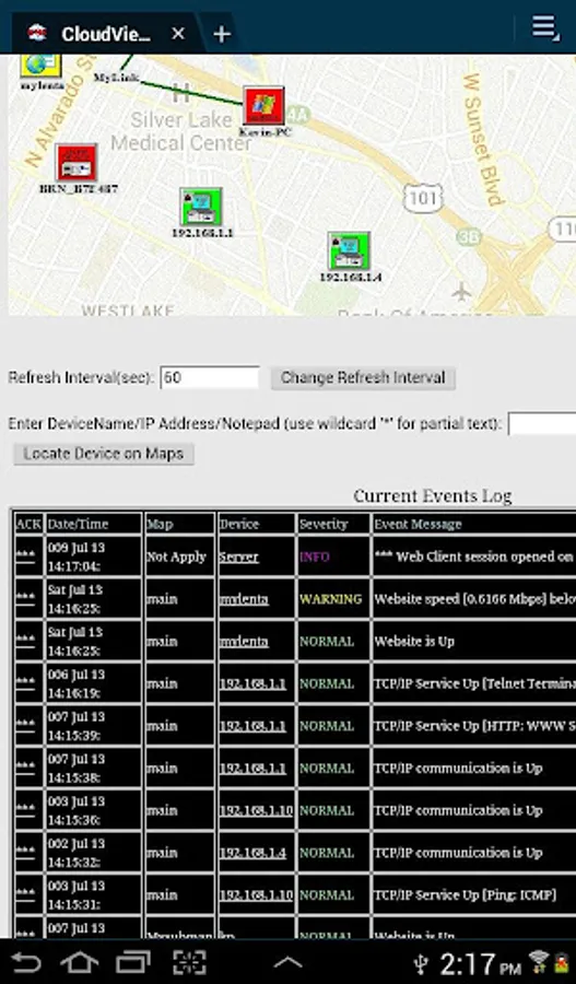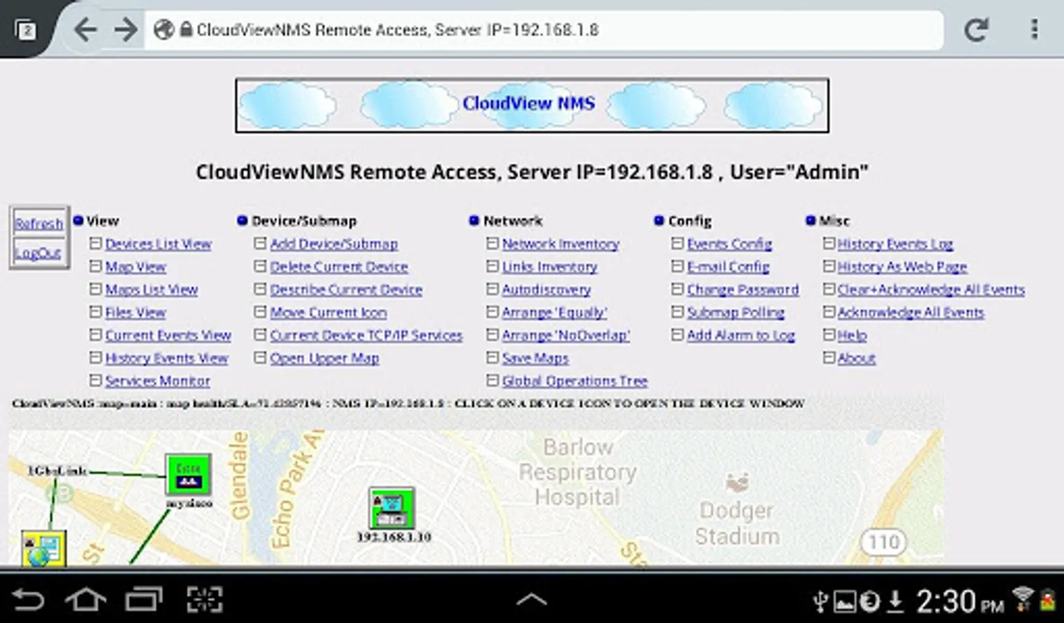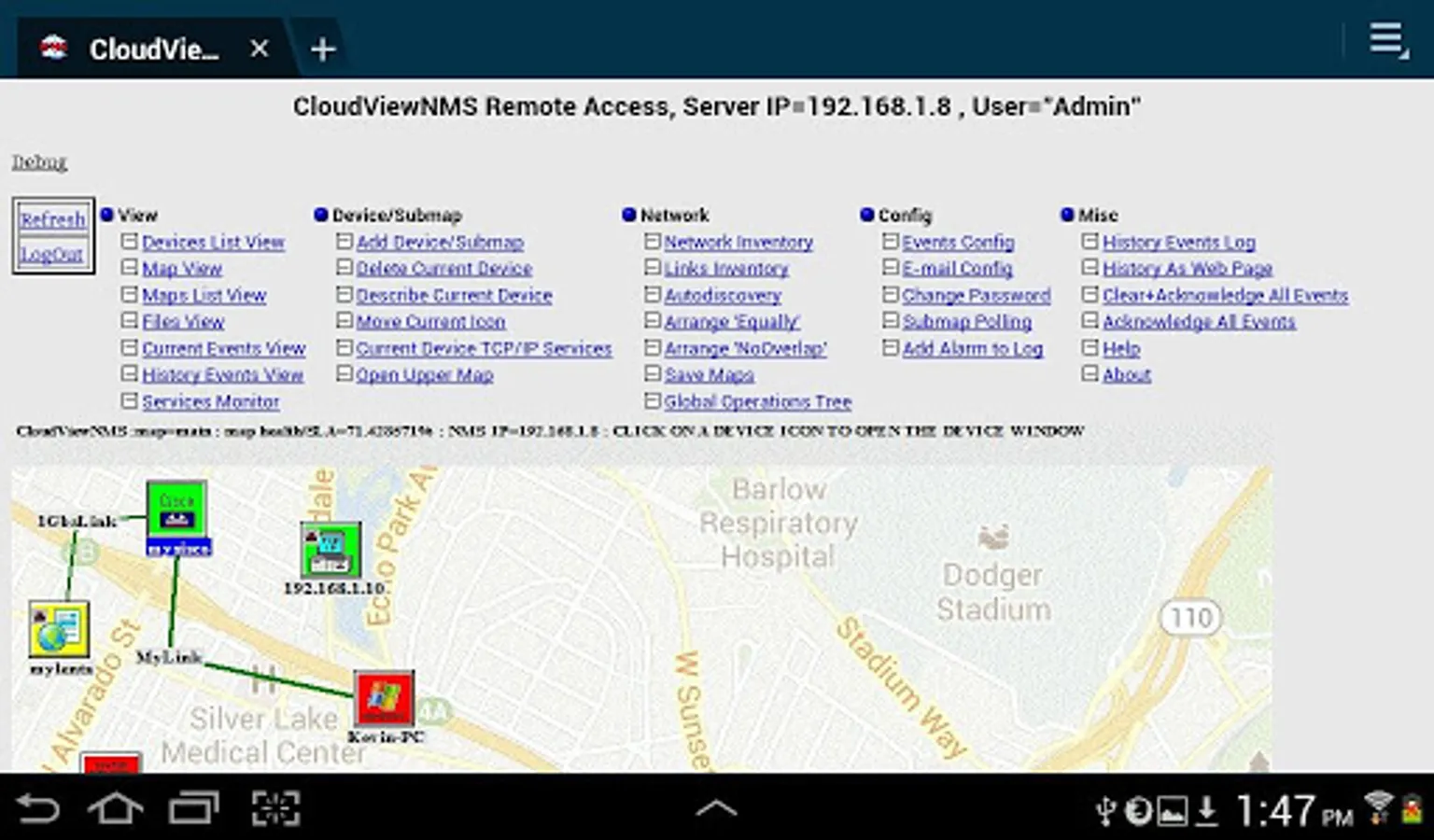 This app is a client to CloudView, which is a standards-based network management and monitoring system (NMS). It can discover, monitor and perform many functions with virtually any vendor SNMP or TCP/IP devices. It provides you with the consistent geographical view of your whole network (thousands of IP nodes), helps with its configuration, monitoring and troubleshooting. It is client-server system which allows secure performing NMS functions by multiple remote users simultaneously . There is no special client software required: any modern web browser can be used to access CloudView GUI remotely. Mobile devices browsers are also supported as remote web console. Additionally dedicated client mobile apps (Android, IOS , Win 8) provided. CloudView can be successfully used in both enterprise and service provider networks with carrier-grade reliability and security. CloudView NMS provides 24 x 7 performance and availability monitoring at multiple levels: network/map/submap/device/interface . Multiple connected ports/interfaces (from different devices in your network) can be described and monitored as "service". Dedicated web portals with different level of access can be used by service provider customers to monitor their SLA's. The features also include: auto-discovery; "Top 10" ( allows to report most used or most faulty ports/interfaces in large networks); historical reports of real ports/interfaces speed/utilization; all SNMP versions support (SNMPv1, SNMPv2, and SNMPv3; capability to compile any vendor private SNMP MIBs and create corresponding custom devices types and screens; e-mail notifications of events/alarms and/or SNMP Traps with customized filters; sophisticated alarms correlation algorithm; special app for monitoring web sites performance and response time; capability to auto-discover and monitor performance of mission-critical Layer-7 network services, such as e-mail, FTP, HTTP, etc... and many more.