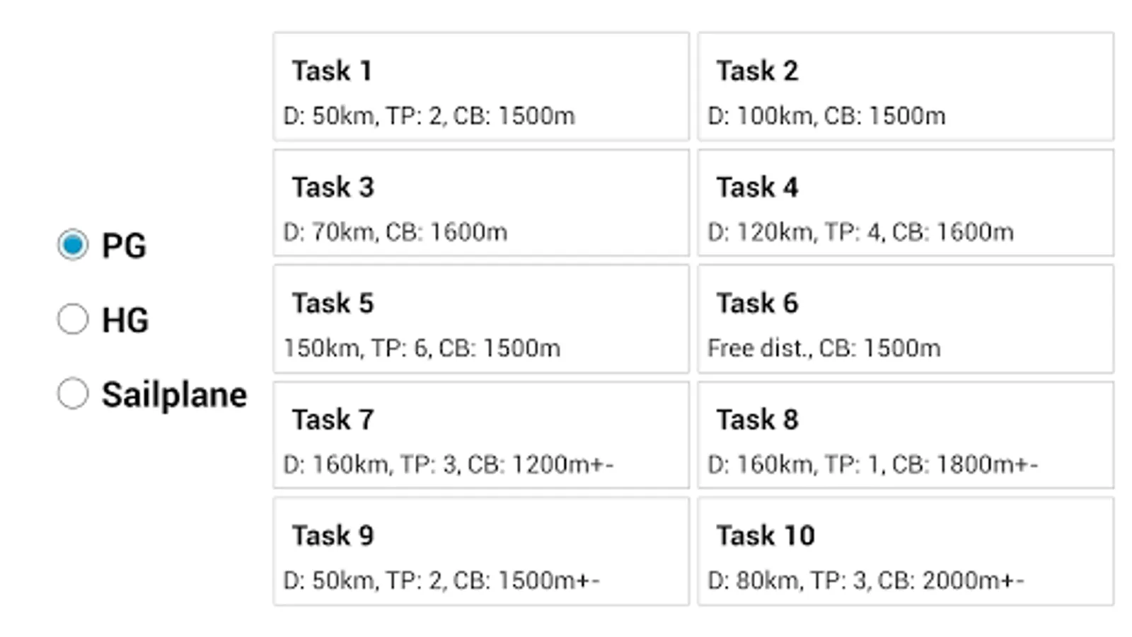 - time based or free distance (max distance possible: 1000km+ on sailplane)