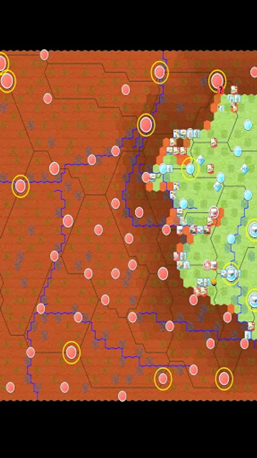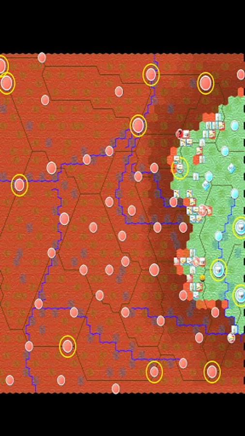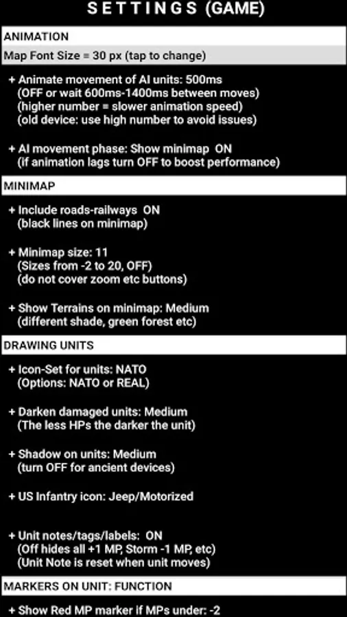 + Settings: Various options are available to alter the look of the gaming experience: Change difficulty level, hexagon size, Animation speed, choose icon set for units (NATO or REAL) and cities (Round, Shield, Square, block of houses), decide what is drawn on the map, and much more.