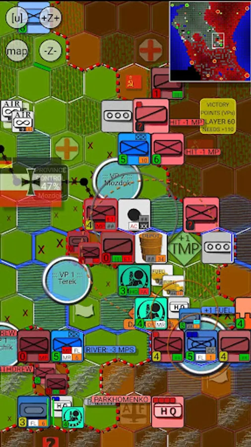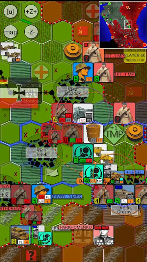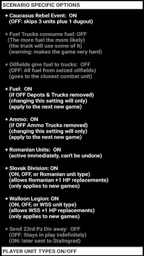 This scenario includes a lot of various unit types without including overwhelming number of units to move, plus the Luftwaffe units will be sent to Stalingrad for a while, so your aerial support varies during the play. The major events include the German-friendly rebellion in the Caucasus mountains and the major Soviet landings on the Axis flank.