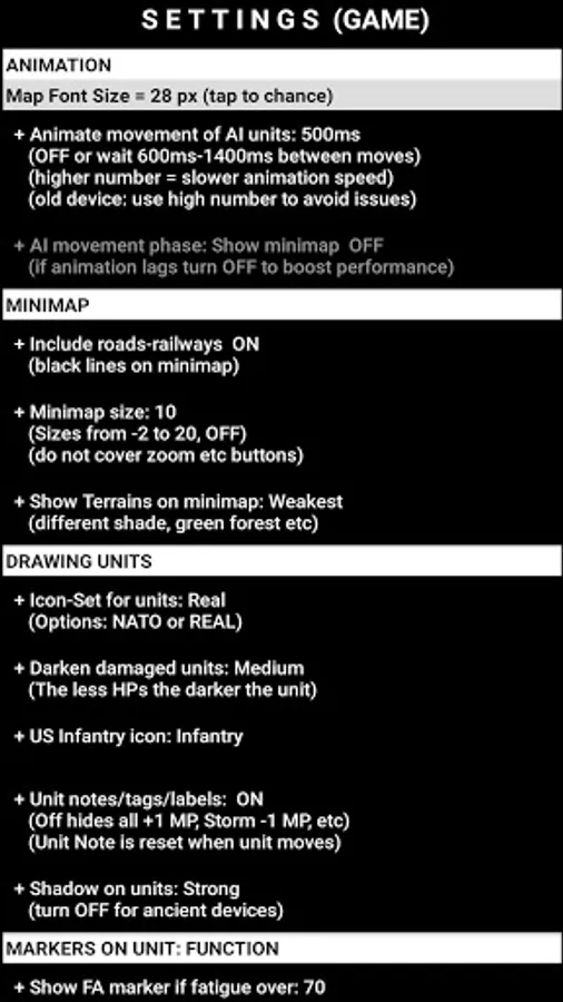 + Settings: A massive list of options are available to alter the look of the gaming experience: Switch between terrain themes, change difficulty level, resource types, choose icon set for units (NATO or REAL) and cities (Round, Shield, or Square), decide what is drawn on the map, change font and hexagon sizes.