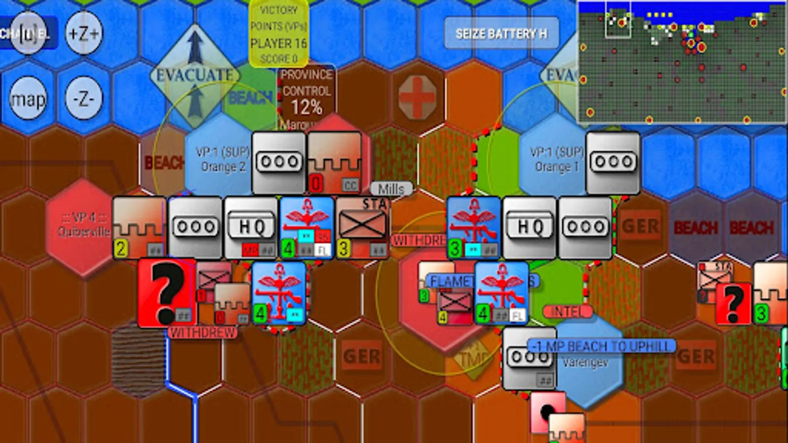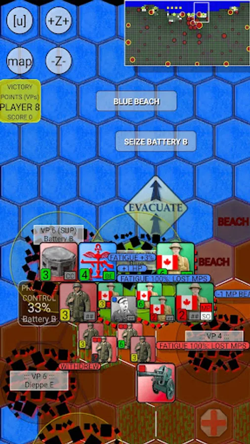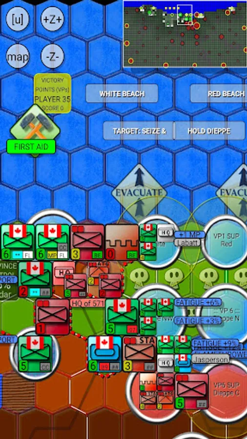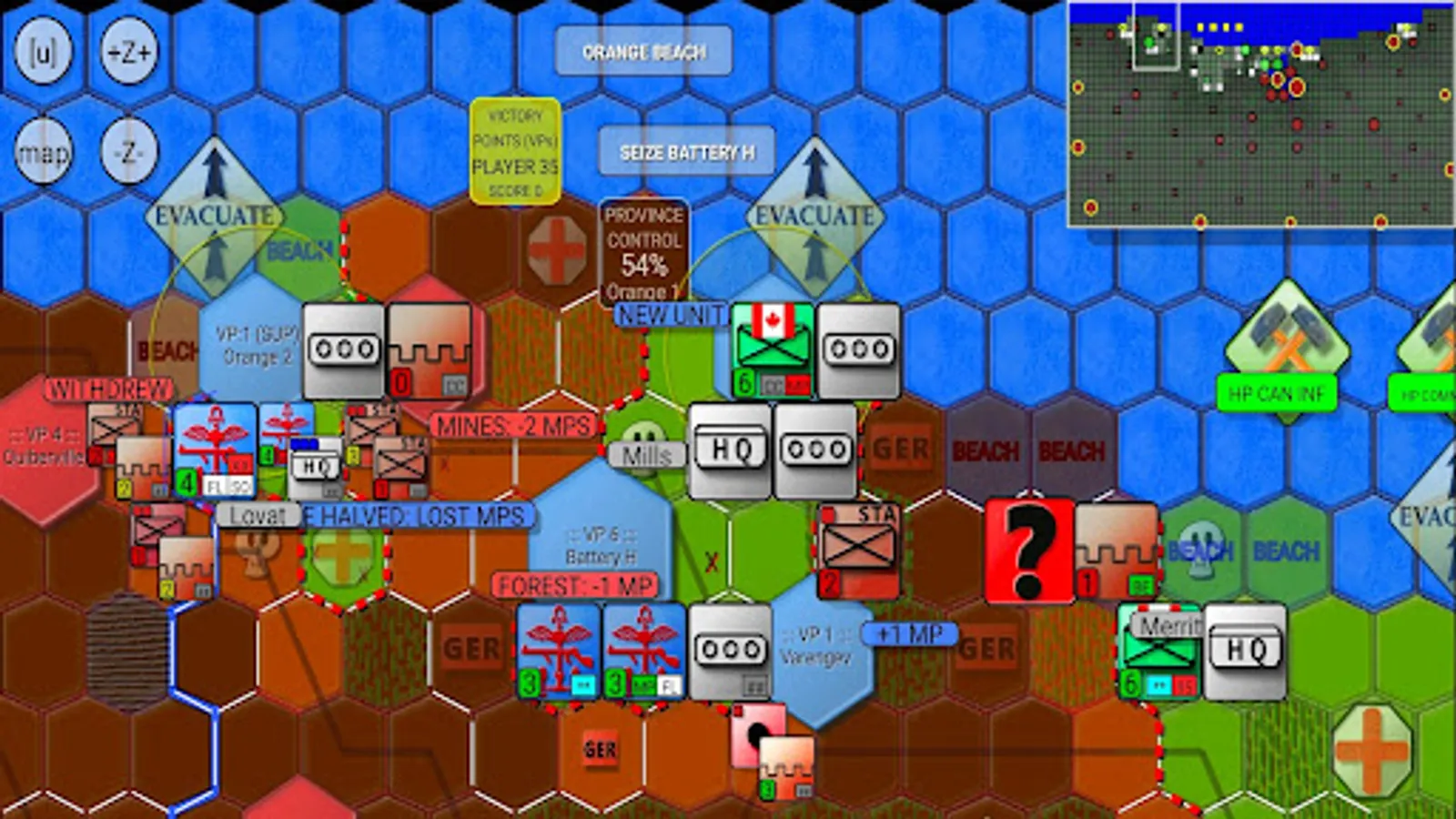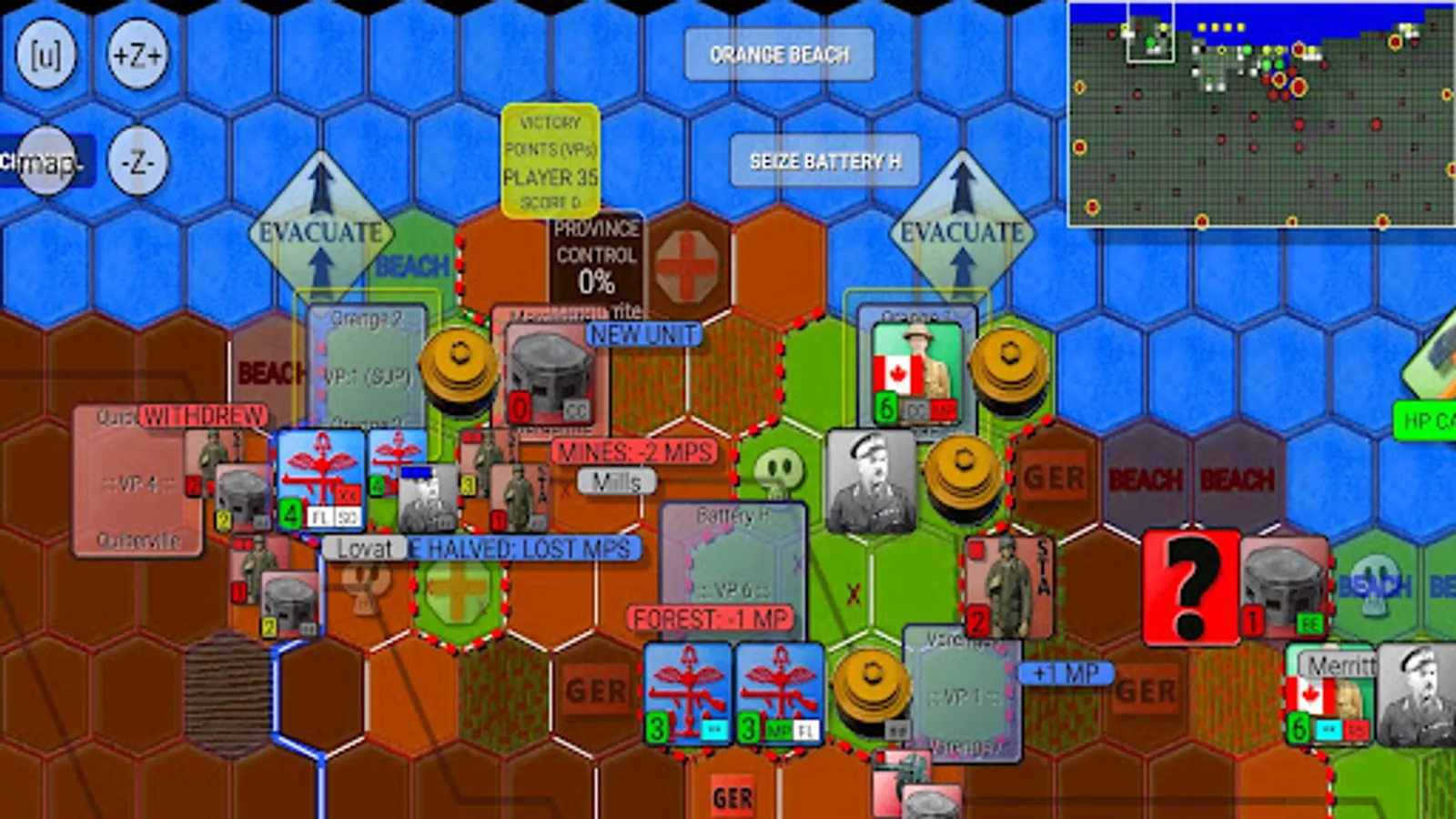 You are in command of the Allied force carrying out the 1942 raid on the port town of Dieppe. The aim is to capture as much of the nearby area as possible, hold it for a while, and evacuate before the Germans gather their elite divisions in this coastal area for a counter-strike. Your score will reflect both the cumulative VPs collected and the number of units evacuated successfully.