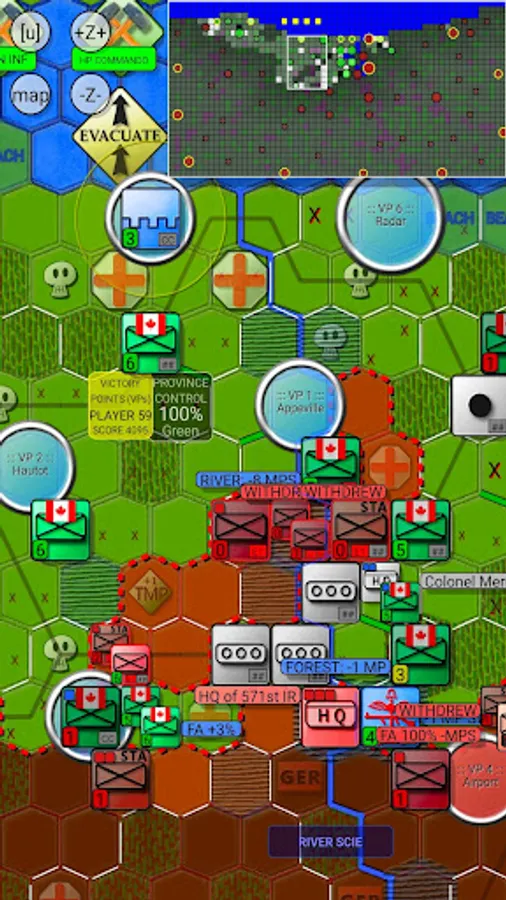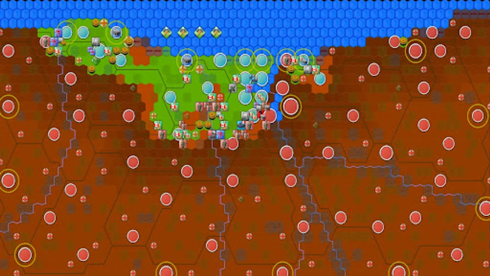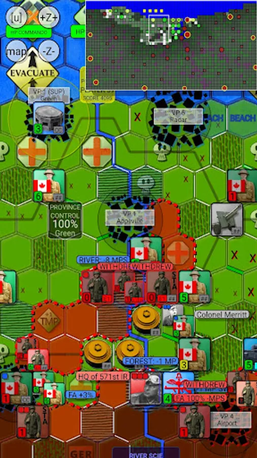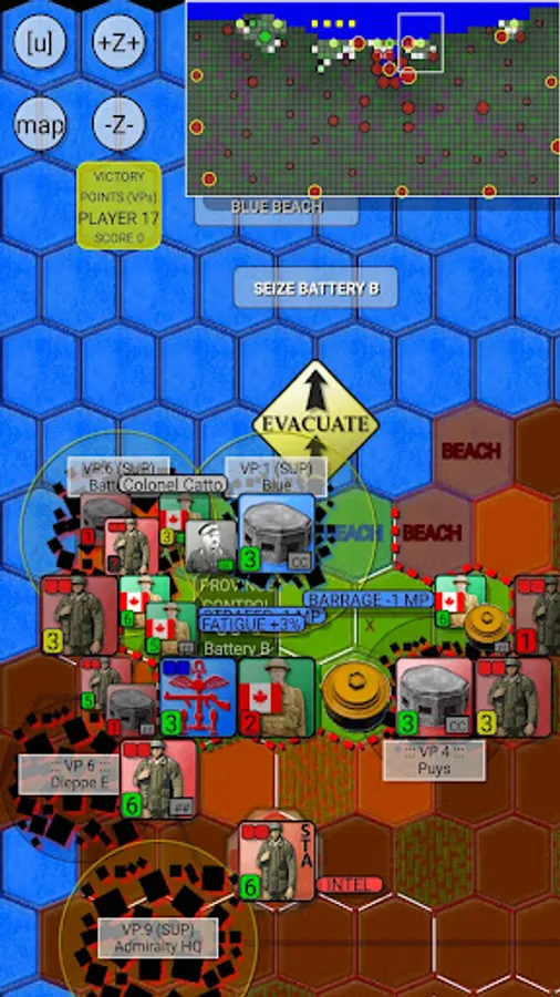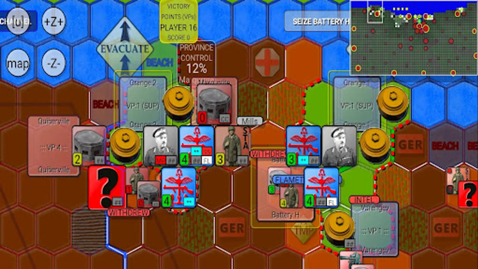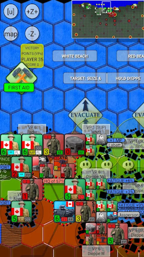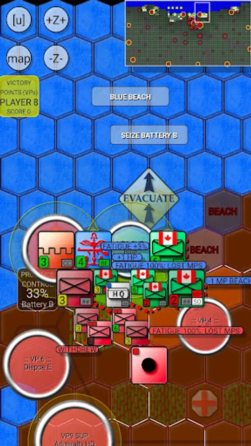 You are in command of the Allied force carrying out the 1942 raid on the port town of Dieppe. The aim is to capture as much of the nearby area as possible, hold it for a while, and evacuate before the Germans gather their elite divisions in this coastal area for a counter-strike. Your score will reflect both the cumulative VPs collected and the number of units evacuated successfully.