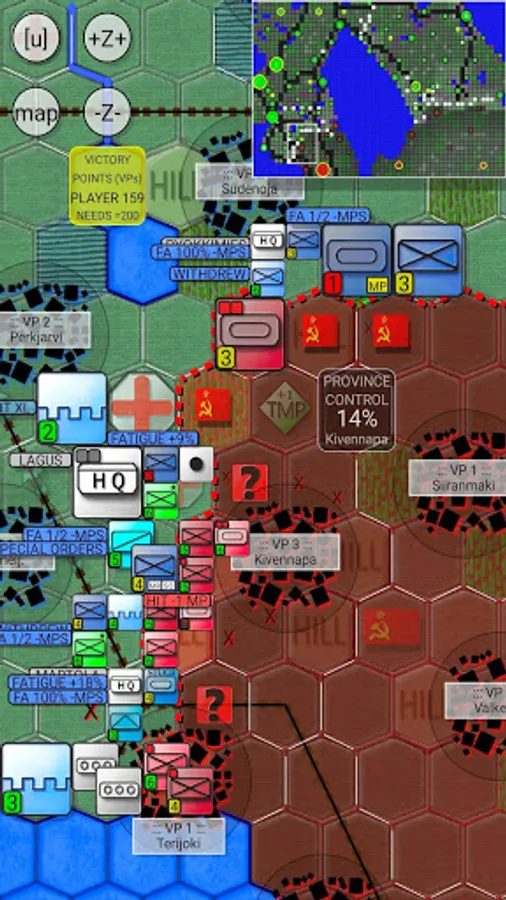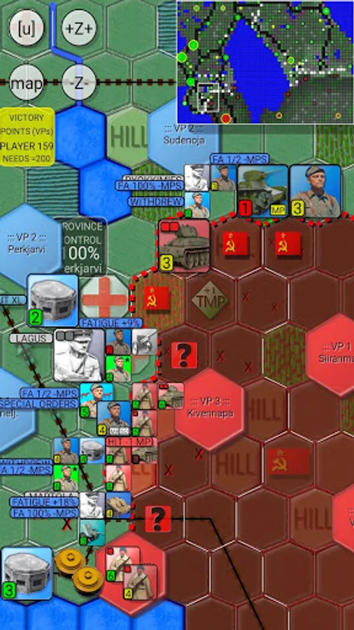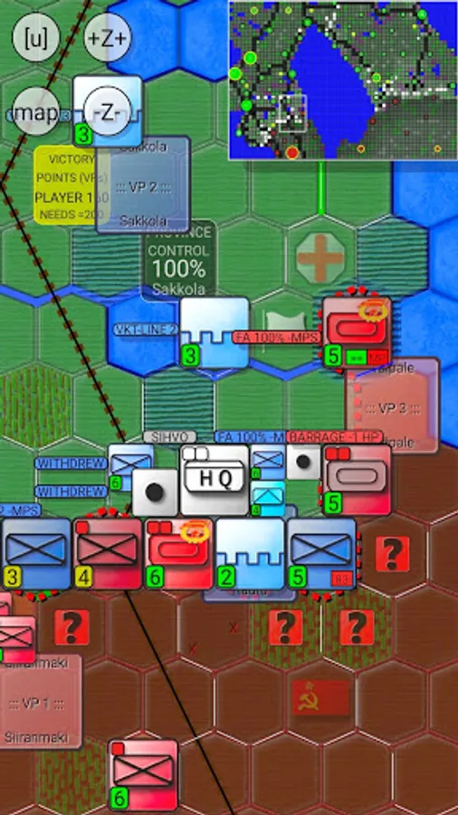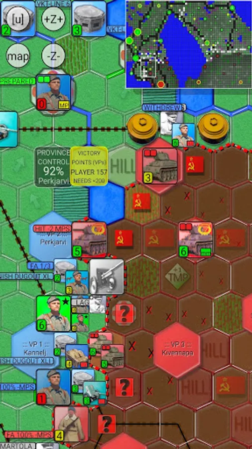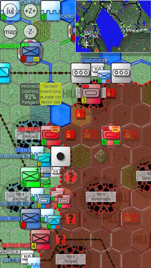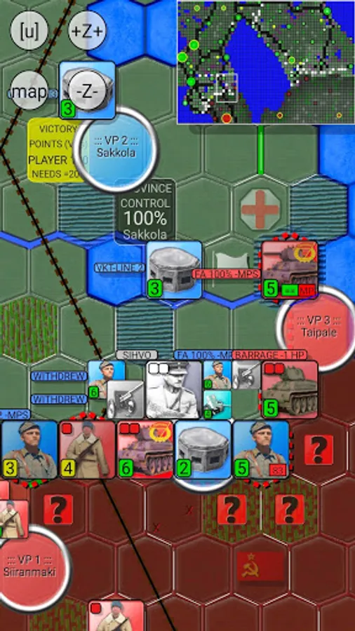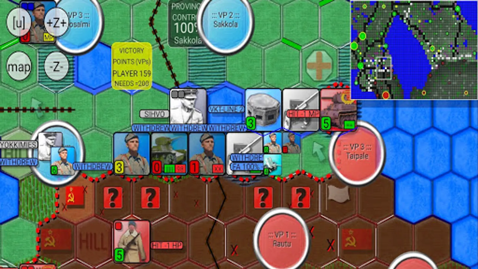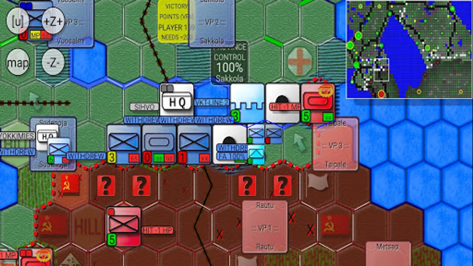 Can you lead the Finnish forces brilliantly enough to stop the massive Red Army offensive that aimed to knock Finland out of the Second World War? The years 1942–1944 were quiet on the Finnish part of the Eastern Front: soldiers did wood whittling, few saw combat, and the wrong places of the front line were fortified, all this while the Red Army was taking lessons in modern warfare from the Wehrmacht. When the Soviet strike finally fell in the summer of 1944, it was a huge, well-practiced attack by a thoroughly trained army with unprecedented artillery barrages against Finns who had just extended their summer holiday leaves. The game ends when you either control all the victory points or have lost control of all the VPs (you held on as long as possible).