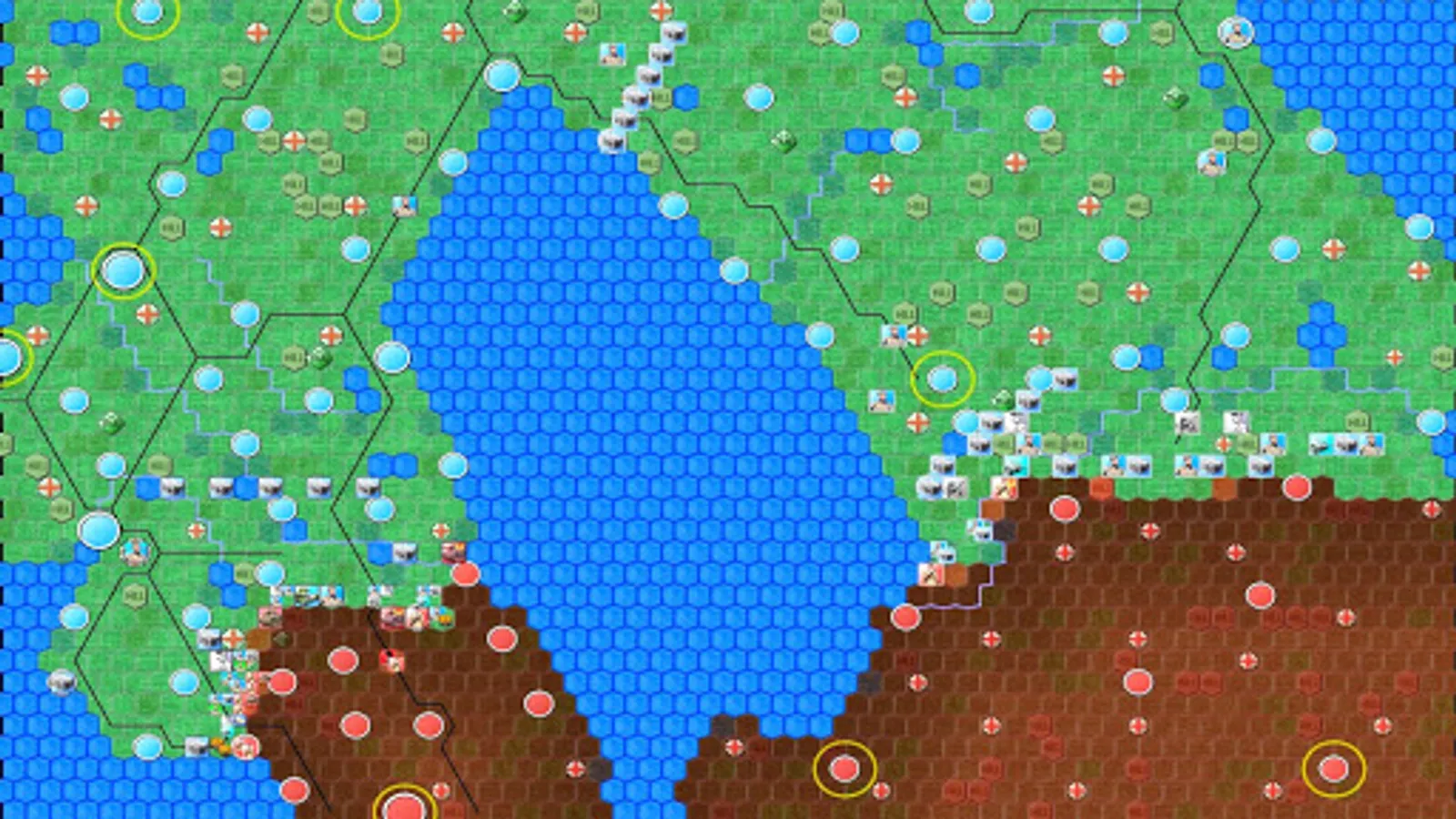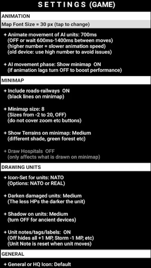 + Settings: Plentiful options to alter the look of the gaming experience: Change difficulty level, hexagon size, what resources are in play, Animation speed, choose icon set for units (NATO or REAL) and cities (Round, Shield, Square, block of houses), decide what is drawn on the map, and much more.
