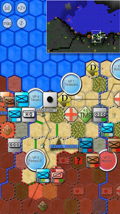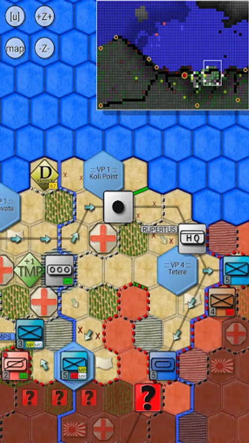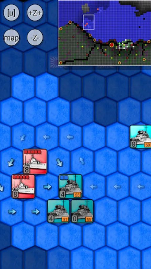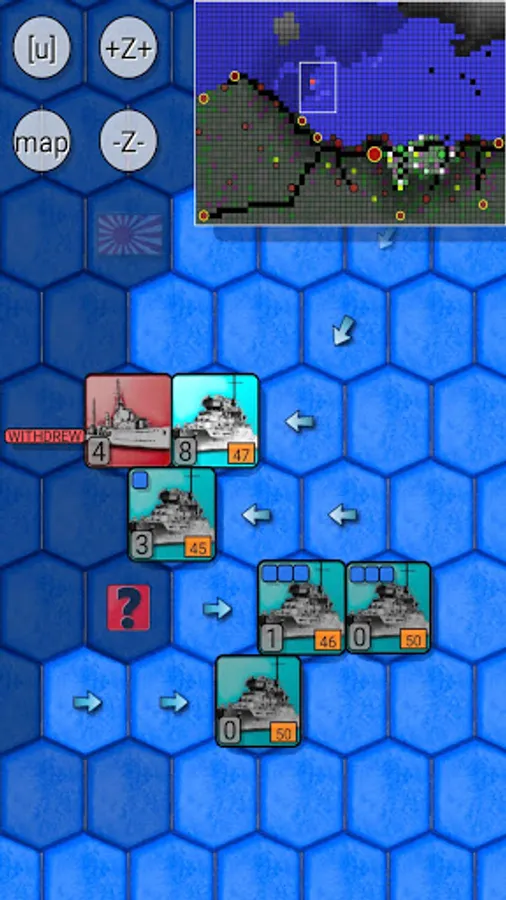 The movement of naval units is limited by their fuel, so these warships must either be refueled by fuel tankers or reach the harbors, located on the eastern edge of the map, to get refueled and refitted.