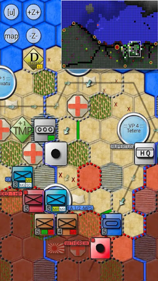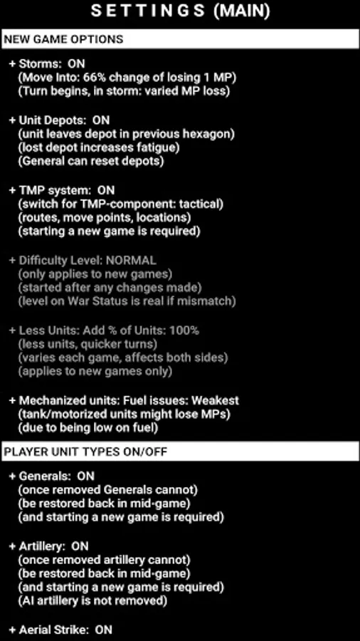 + Settings: Various options are available to alter the look of the gaming experience: Change difficulty level, hexagon size, Animation speed, choose icon set for units (NATO or REAL) and cities (Round, Shield, Square, block of hourses), decide what is drawn on the map, and much more.