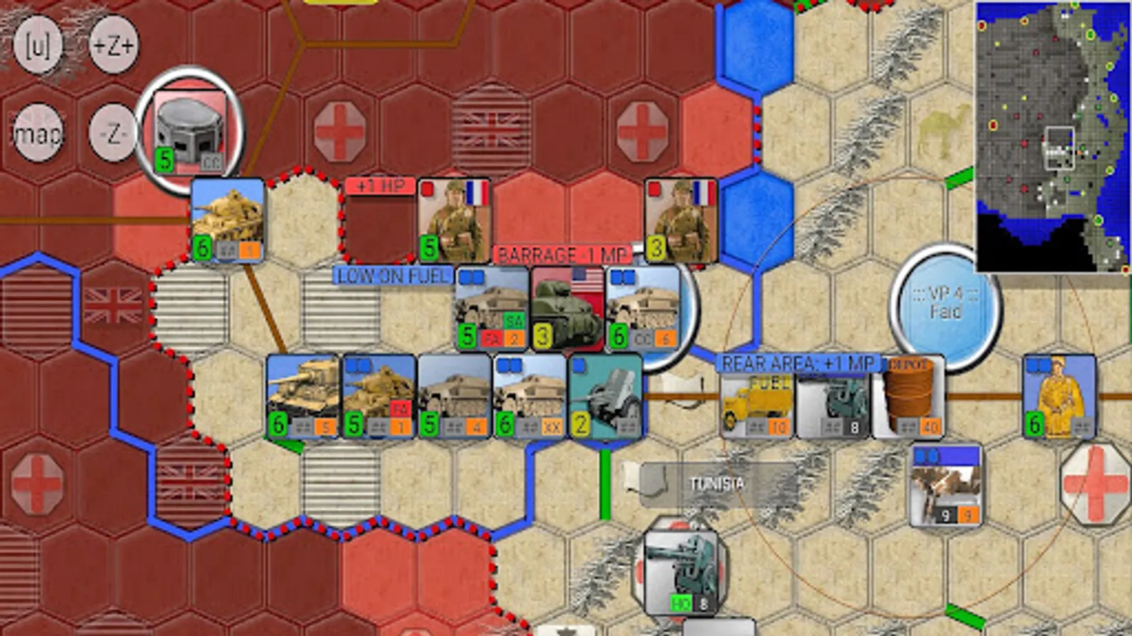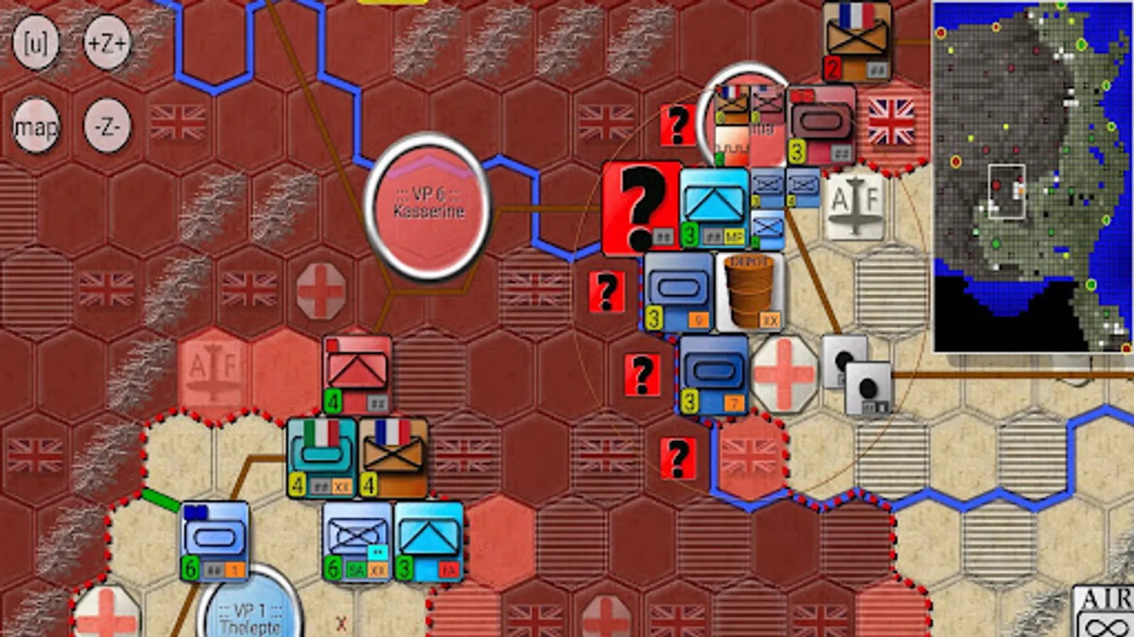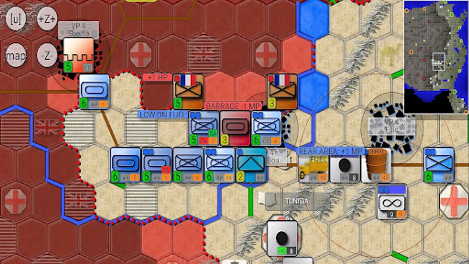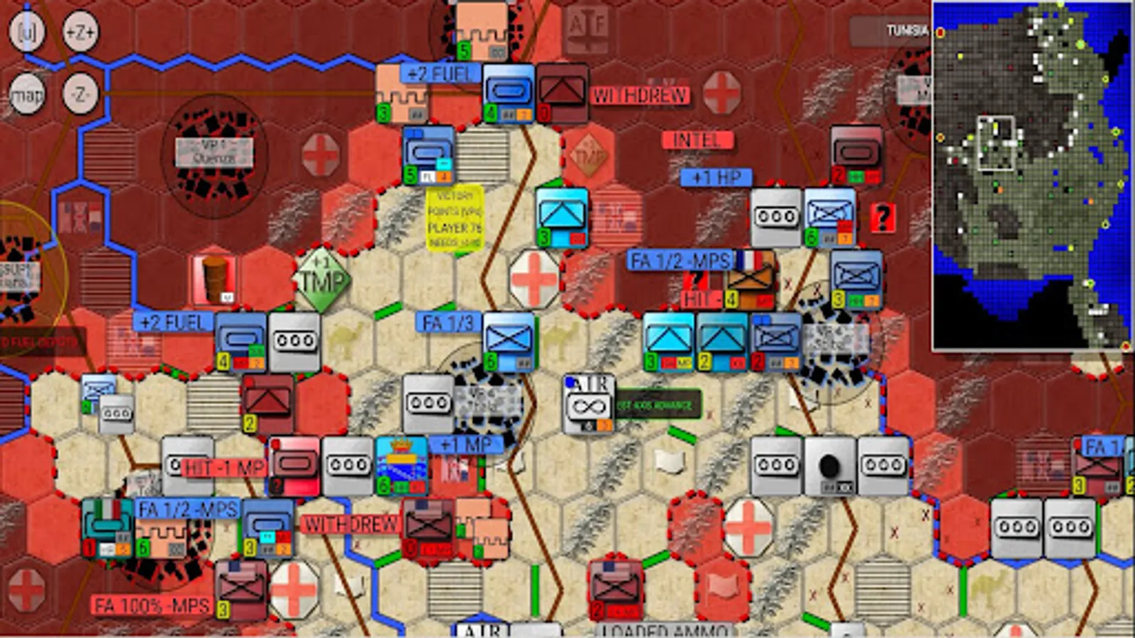 The Allies are rebuilding and regrouping after the failed run to Tunis; the British 8th Army is still far away; and the Allied stranglehold on the Axis supply routes from Europe to Tunisia is only just starting to severely reduce the flow of resources. This is the perfect chance for the Axis units concentrating in Tunis to try to flank and encircle a handful of the most advanced Allied divisions by attacking via the Kasserine Pass to take on the inexperienced Americans, seizing the Allied fuel depots located behind the city of Tebessa, and using that extra fuel to drive Panzer Divisions all the way to the city of Bone (northwest corner). If successfully carried out, this difficult maneuver might, once again, turn the tide of war in North Africa and maybe even prevent the notorious collapse of the Axis armed forces in Tunisia.